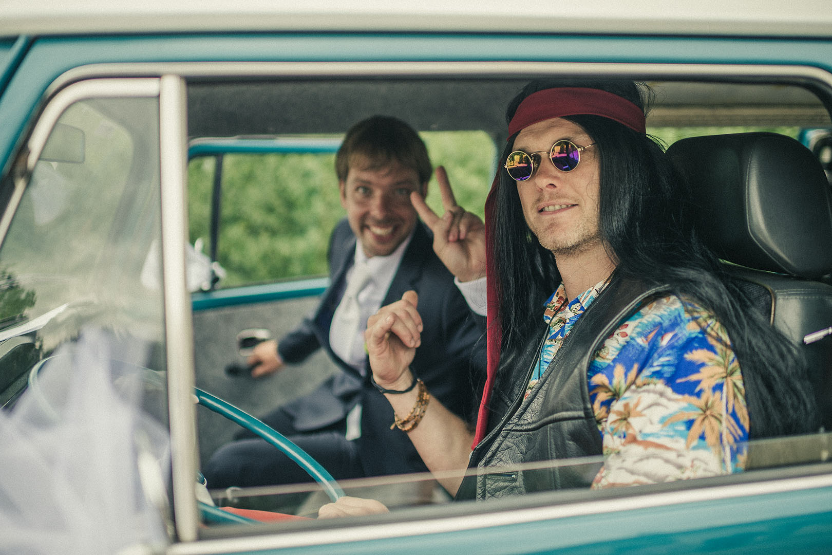 Ony plechové lásky jsme ukázali jak na fotografování portrétů před svatbou (z nichž si nakonec vyráběli svatební oznámení), tak na samotné svatbě. Tam ještě více přispěli k neformálnímu hippie stylovému oblečení některých jejich přátel.