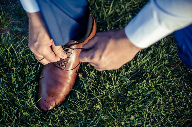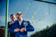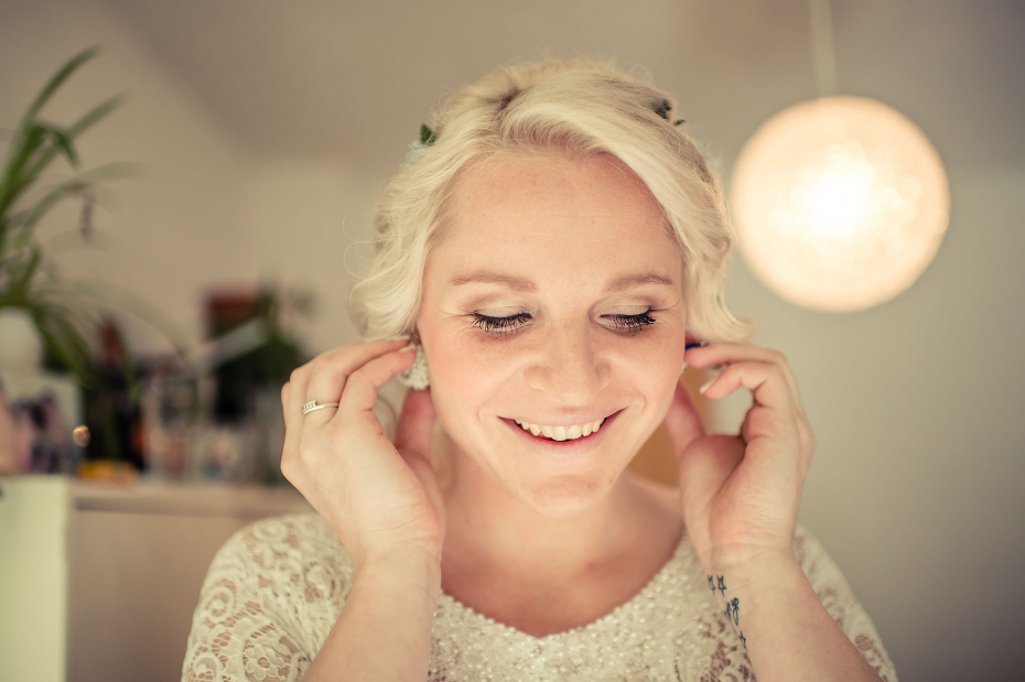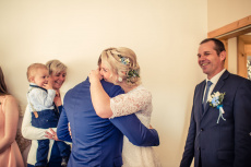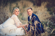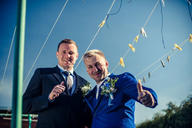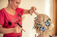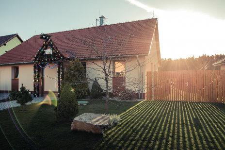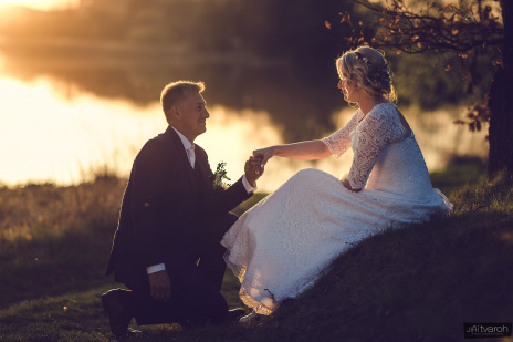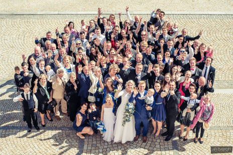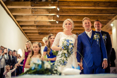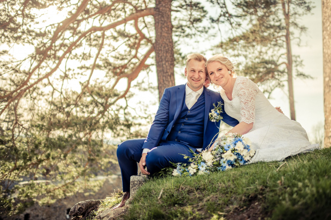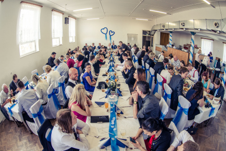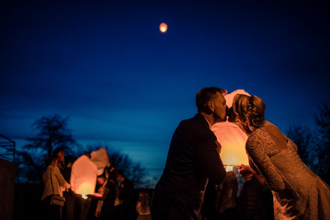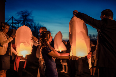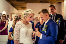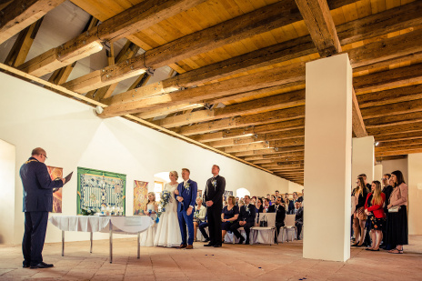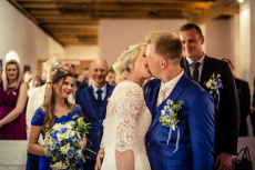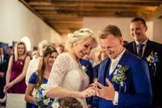Začal jsem tedy přípravami u nevěsty, pak následoval přejezd za ženichem. U Petra jsme narychlo pořídili několik snímků a opět zpět k nevěstě. Zde se svatebčané před odjezdem na obřad ve Vlachově Březí, v Panském pivovaru, občerstvili. Po obřadu následoval poslední přejezd do vesničky, kde měli Barča s Petrem pro všechny přichystán oběd v bílo-modré výzdobě.