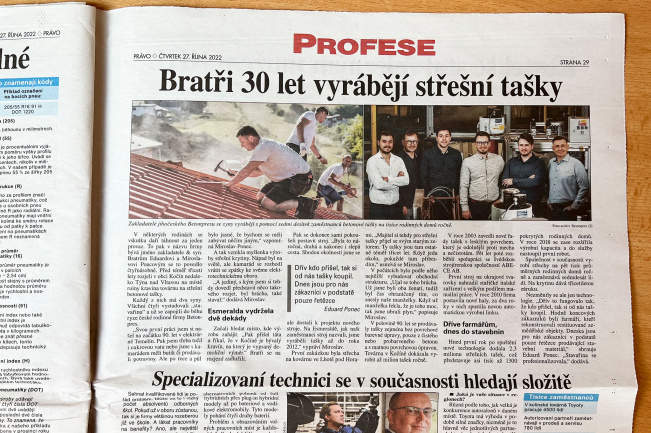 28.12.2022Při fotografování jsme prošli celý proces výroby betonové střešní krytiny - od vstupních surovin, jejicih přípravu, výrobu tašky, povrchovou úpravu, schnutí, balení. Soustředili jsme se zejména na faktickou kvalitu záběru - aby vystihoval to podstatné se zajímavým výtvarným přesahem.