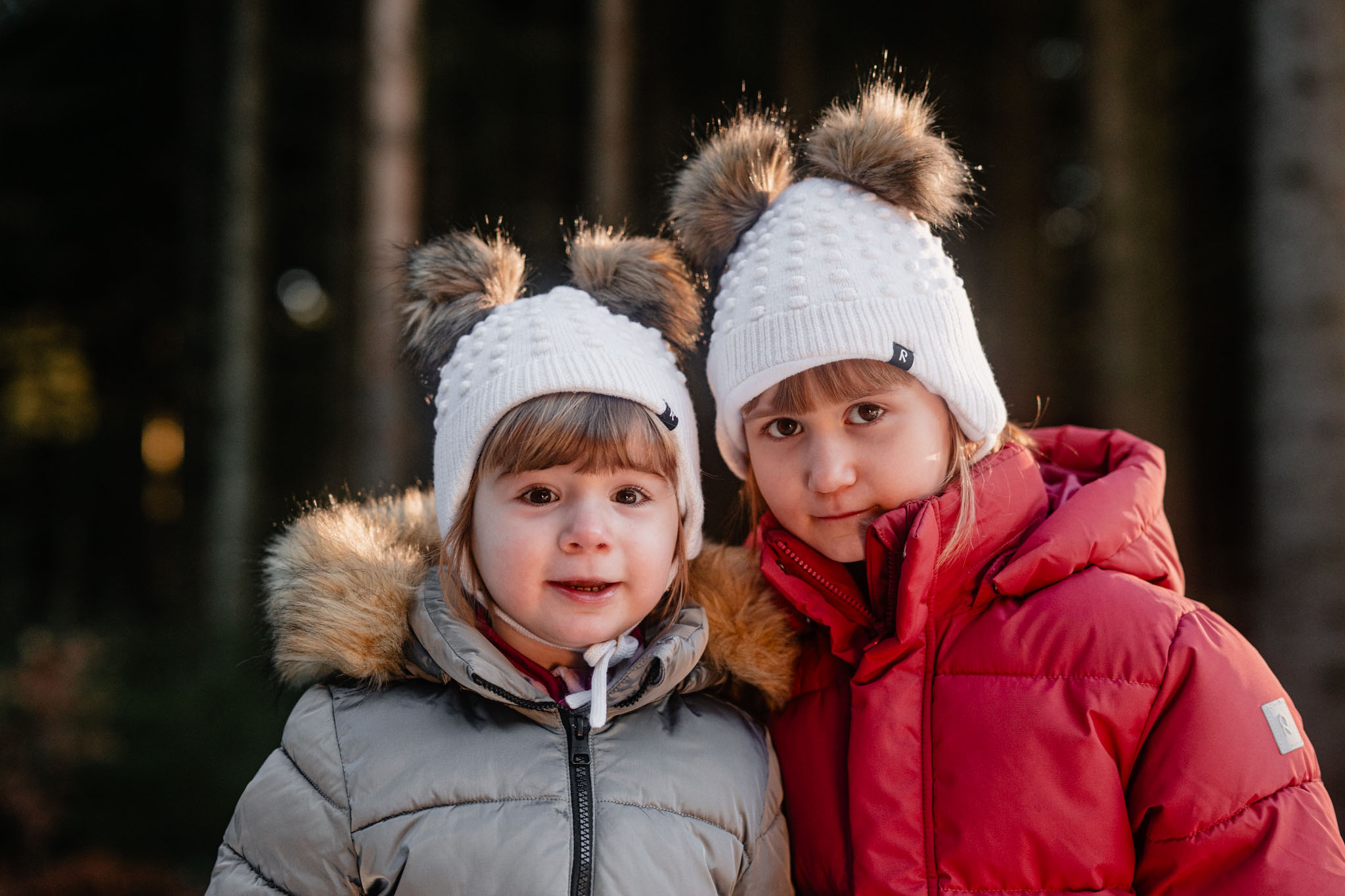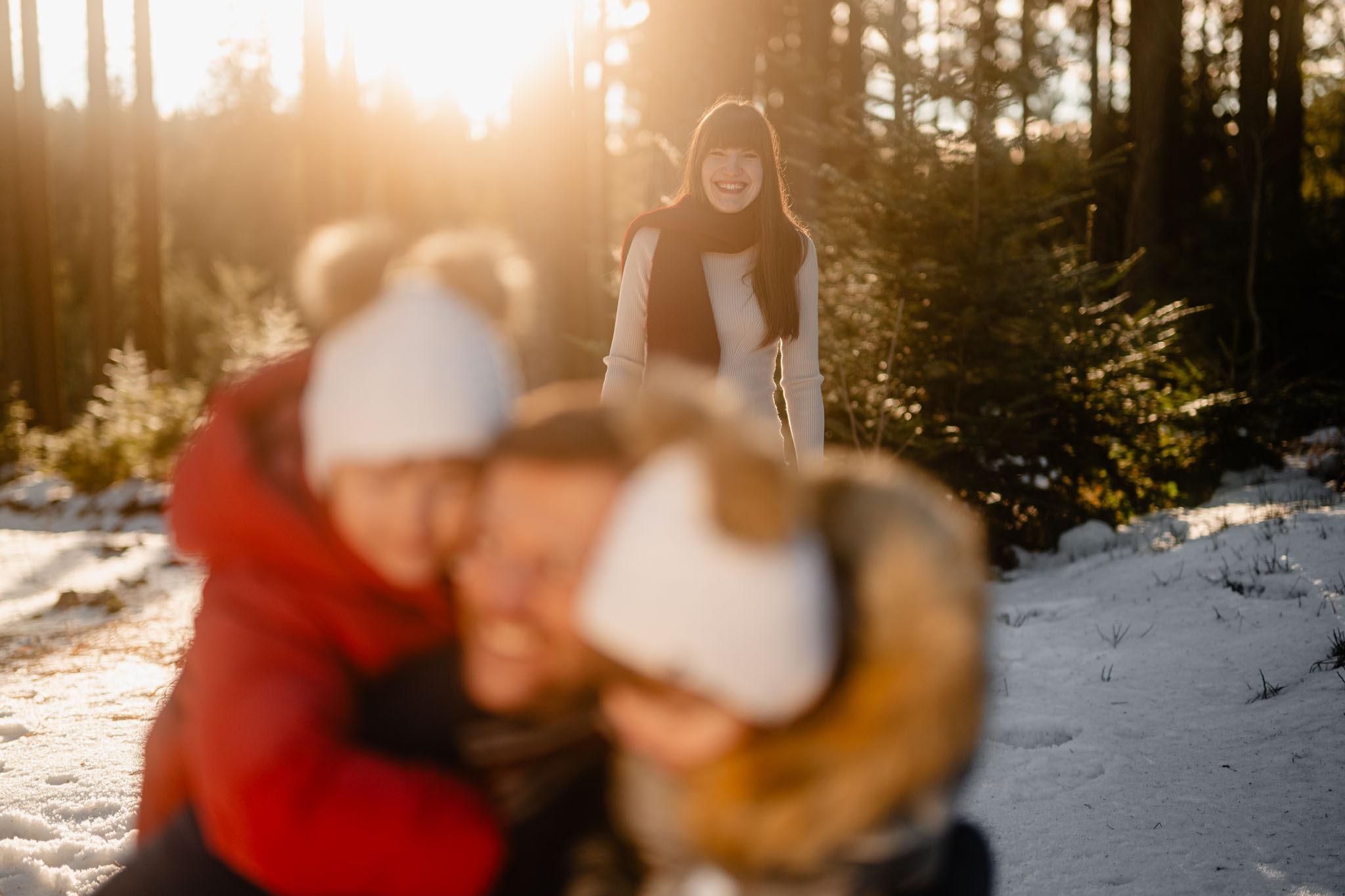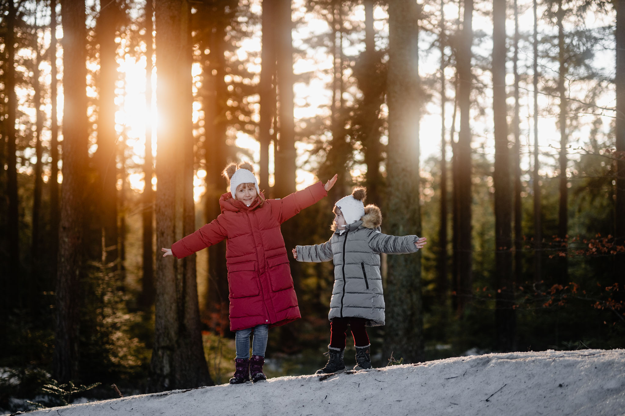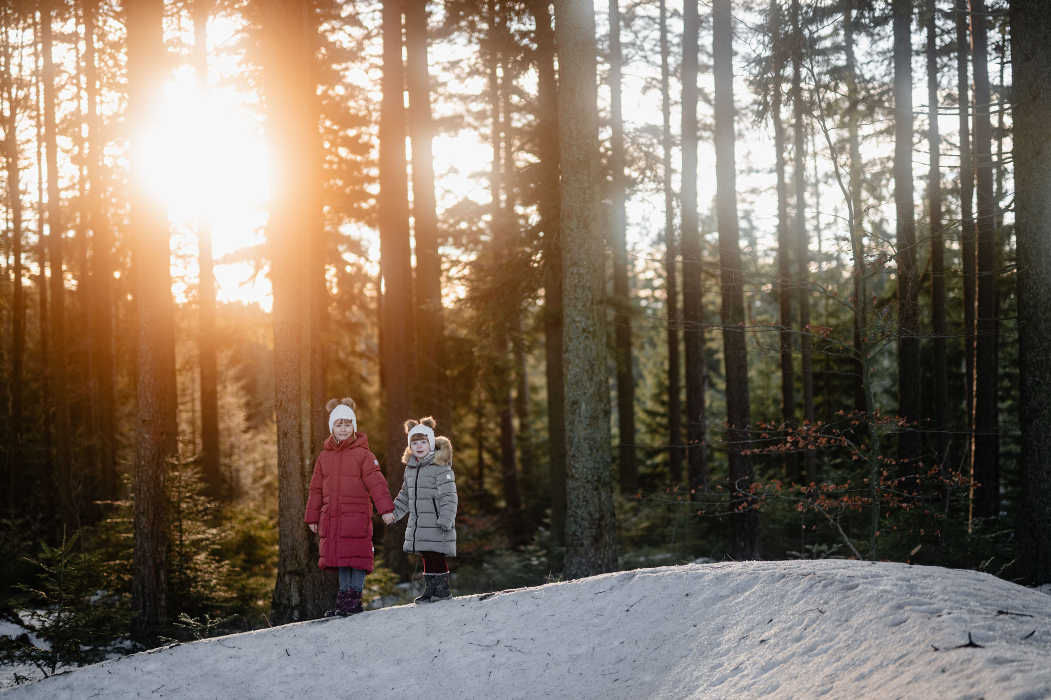 Zimní focení na kopci nad městem, kde bydlí, má své specifické kouzlo. Tlumené barvy, měkké světlo a klidná atmosféra, která nechává vyniknout to podstatné – vztahy. Tentokrát už ale nebylo tak poklidné. Helenka si focení užívala už se sestrou Irenkou a energie byla hned znatelně jiná. Více pohybu, více smíchu, více momentů, které nejdou naaranžovat – jen se stanou.