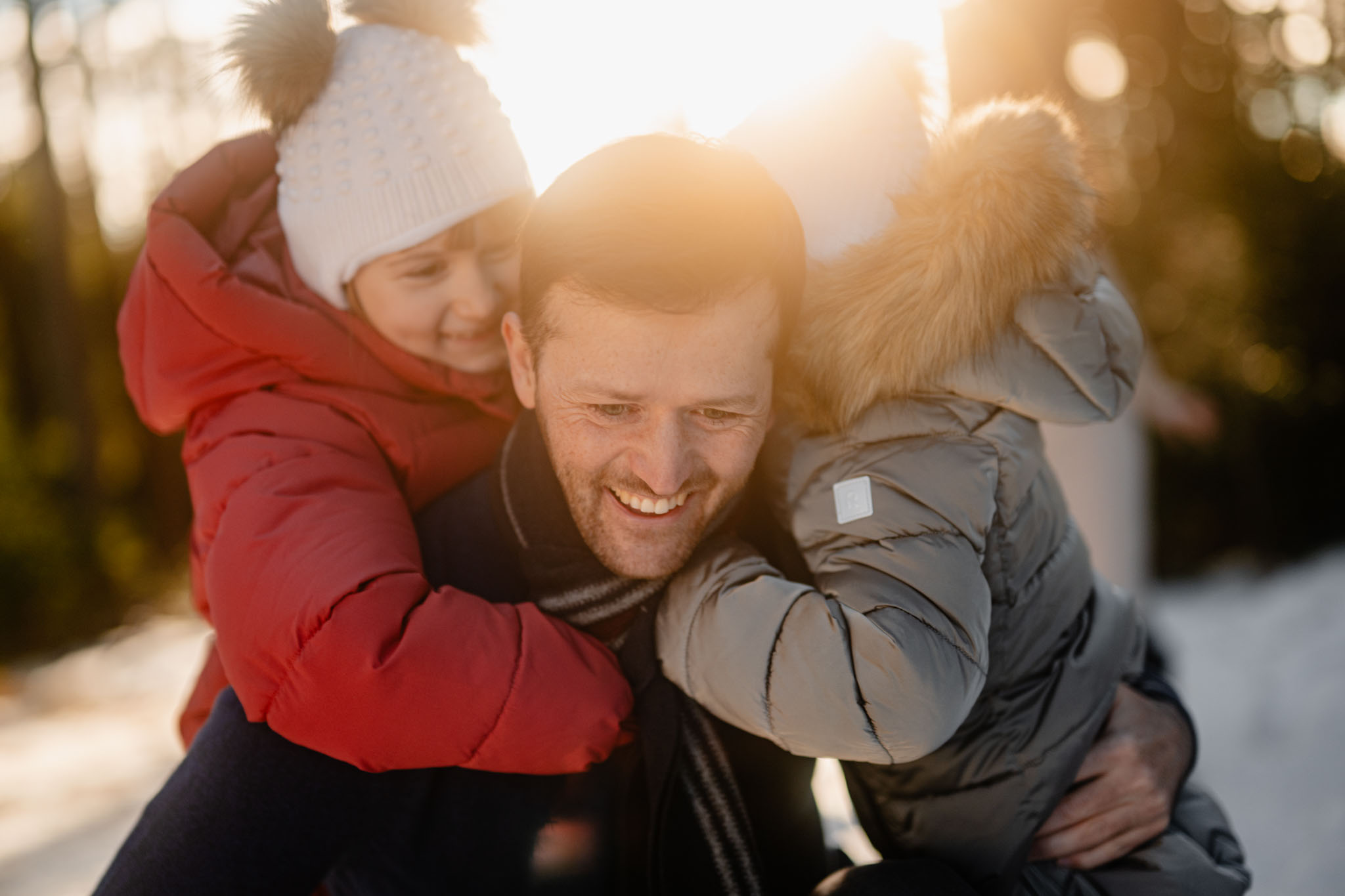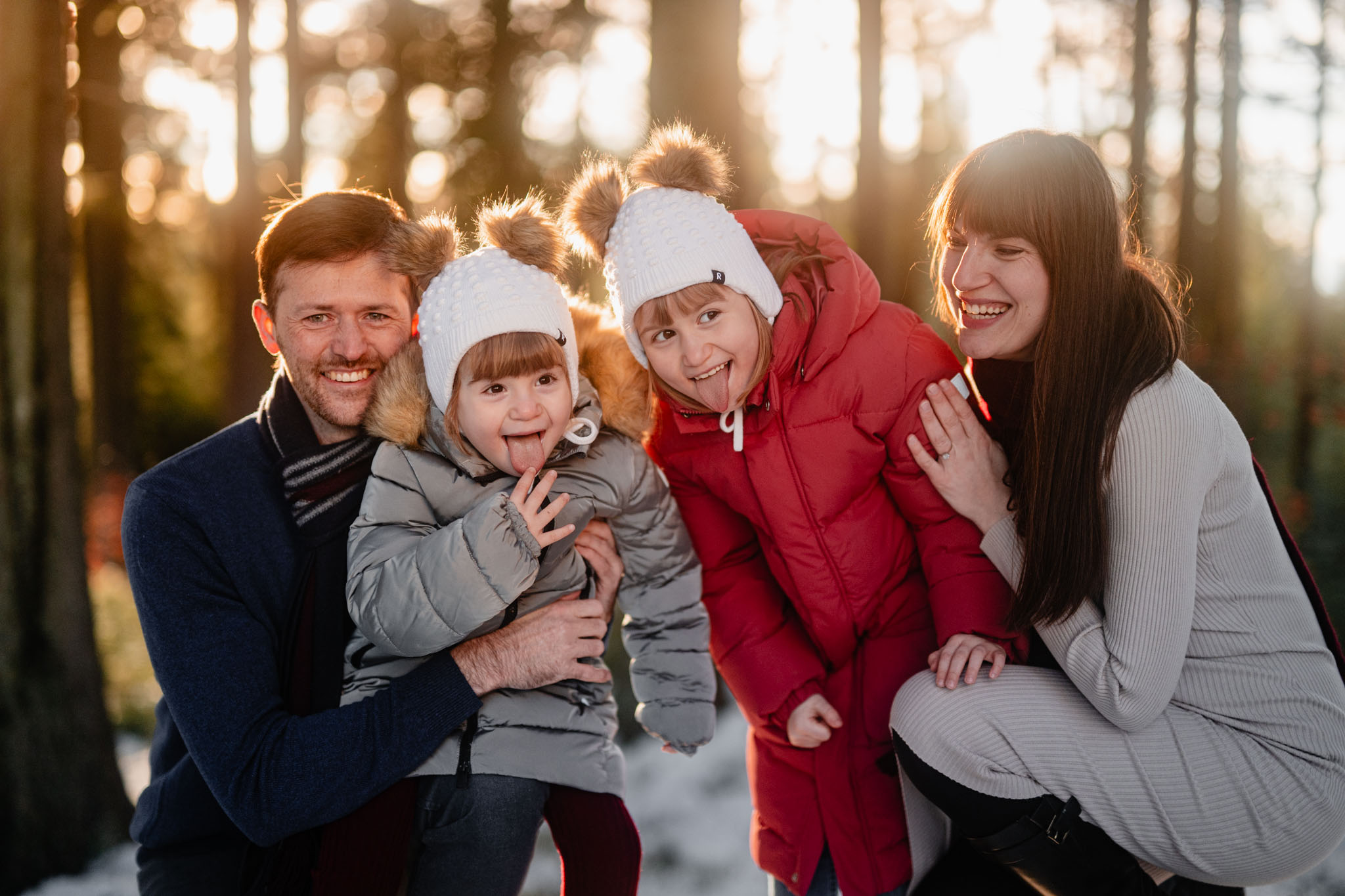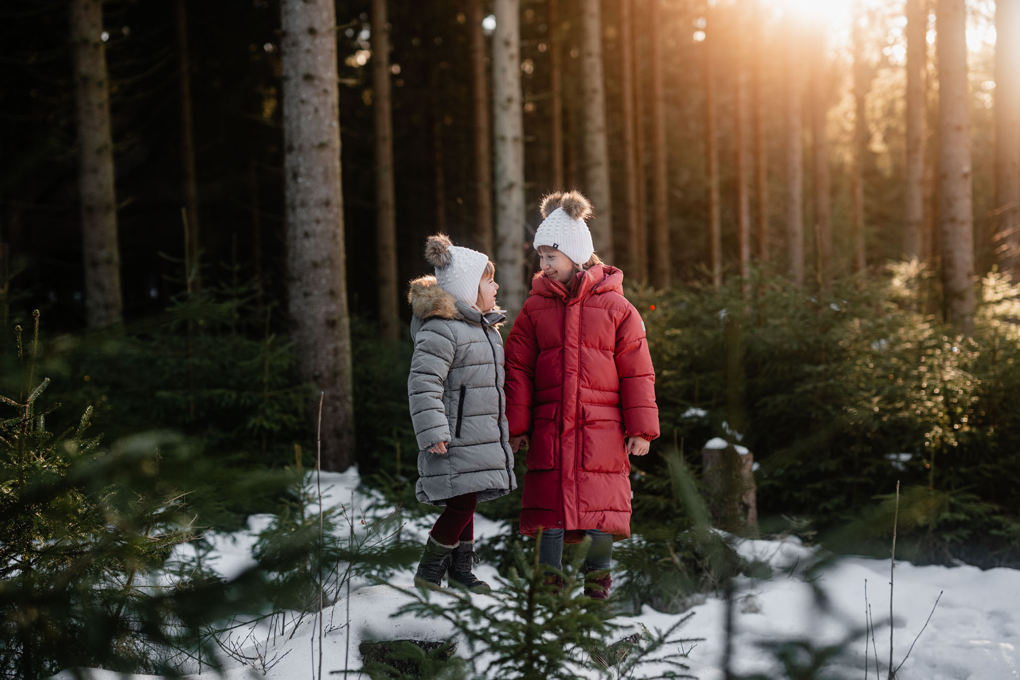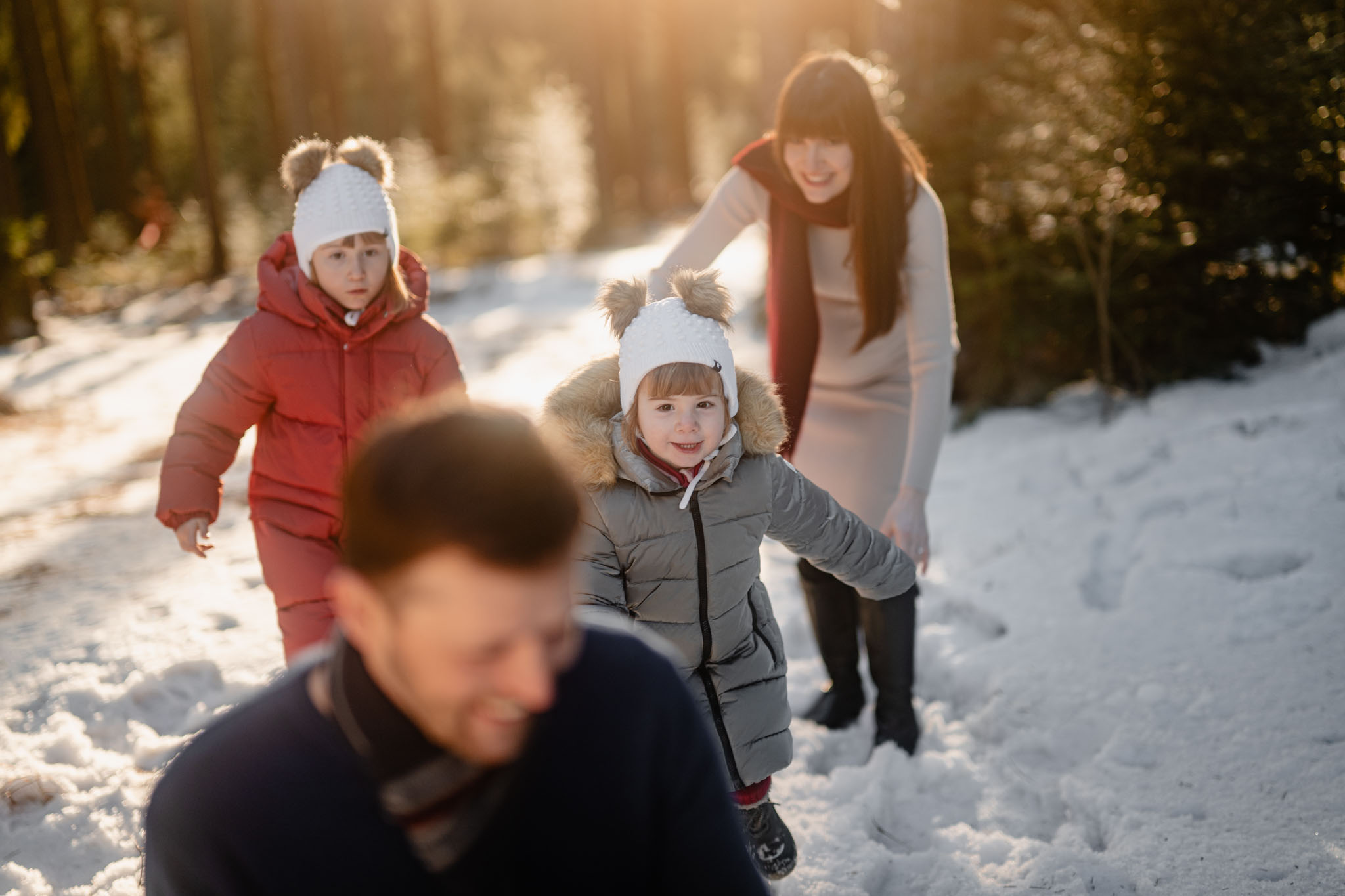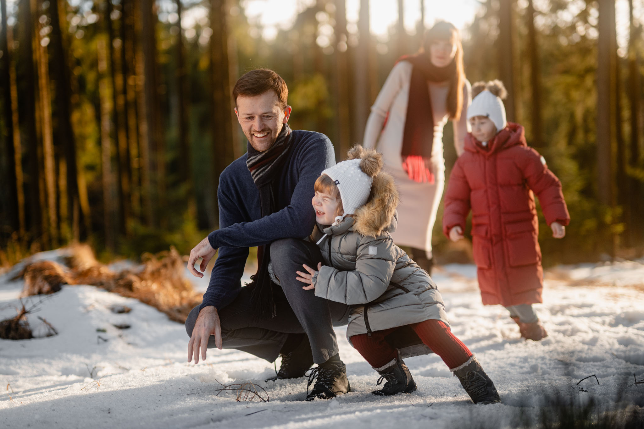 Zimní focení na kopci nad městem, kde bydlí, má své specifické kouzlo. Tlumené barvy, měkké světlo a klidná atmosféra, která nechává vyniknout to podstatné – vztahy. Tentokrát už ale nebylo tak poklidné. Helenka si focení užívala už se sestrou Irenkou a energie byla hned znatelně jiná. Více pohybu, více smíchu, více momentů, které nejdou naaranžovat – jen se stanou.