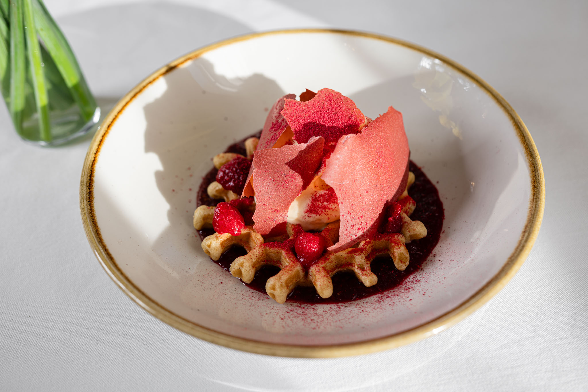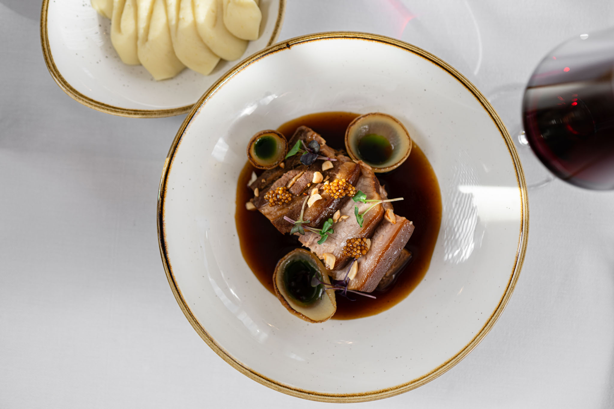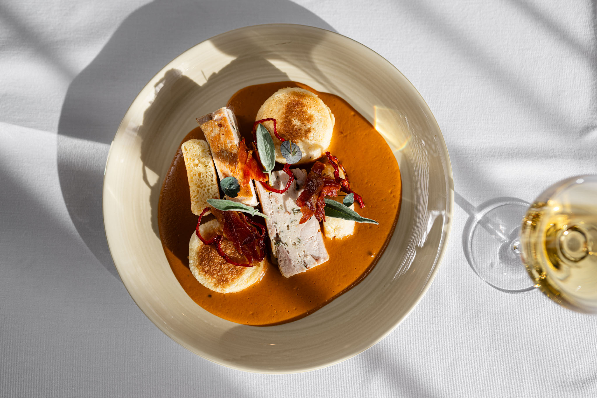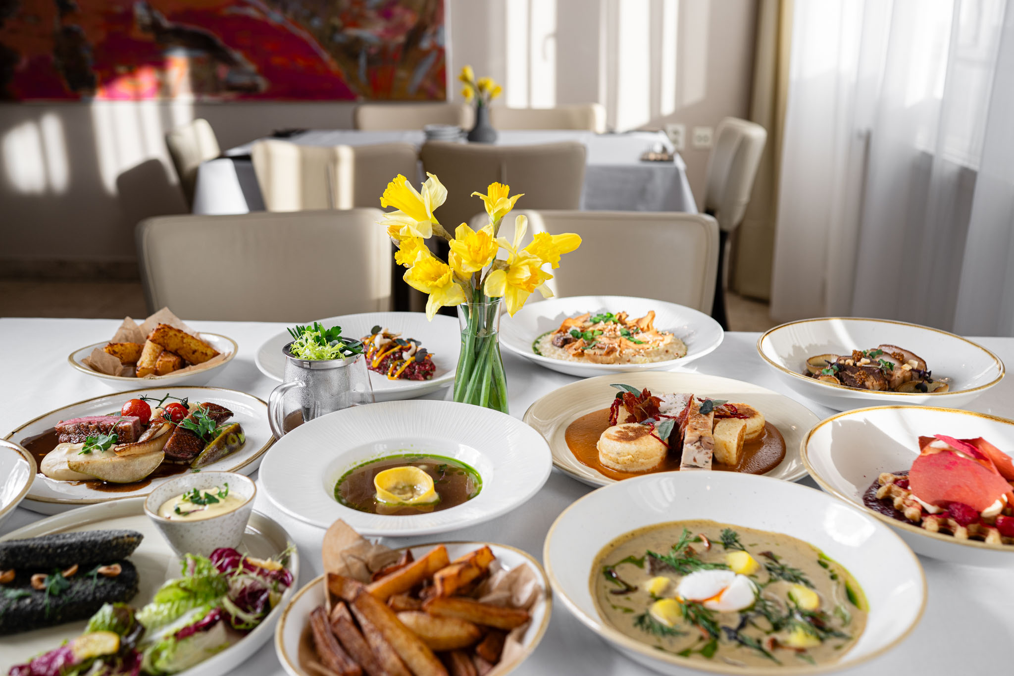 Kompozici doplnily drobné detaily – jarní květiny, víno, suroviny jako přirozené dekorace. Nešlo jen o izolovaný talíř, ale o celkový pocit z menu. O lehkost, sezónnost a radost z jídla.