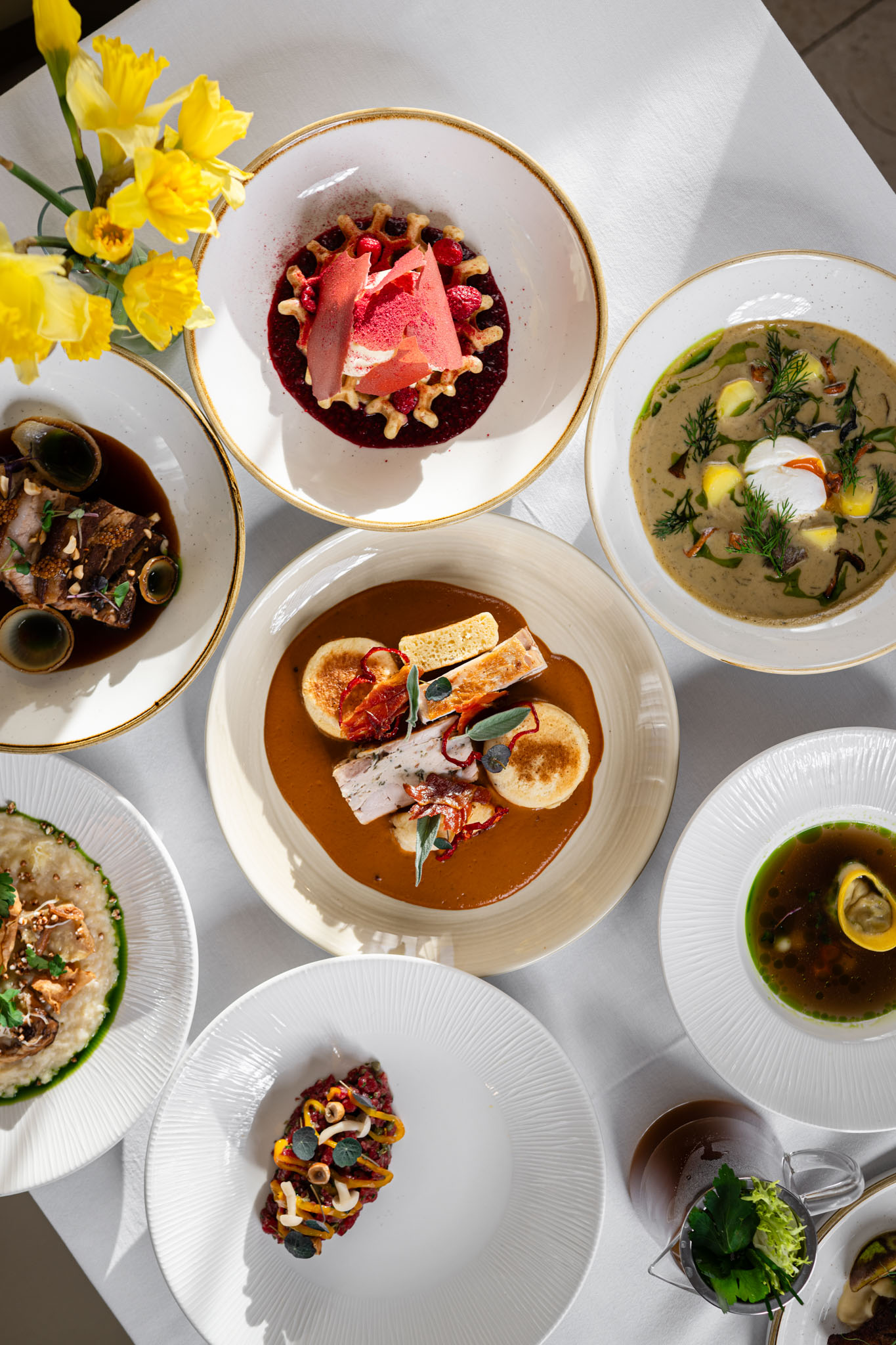 Z přiložených fotek je patrná barevnost i kontrast jednotlivých chodů – od jemných tónů vývaru přes syté barvy dezertu až po strukturovaný předkrm. Každý talíř má svůj charakter, ale společně tvoří ucelený jarní příběh.