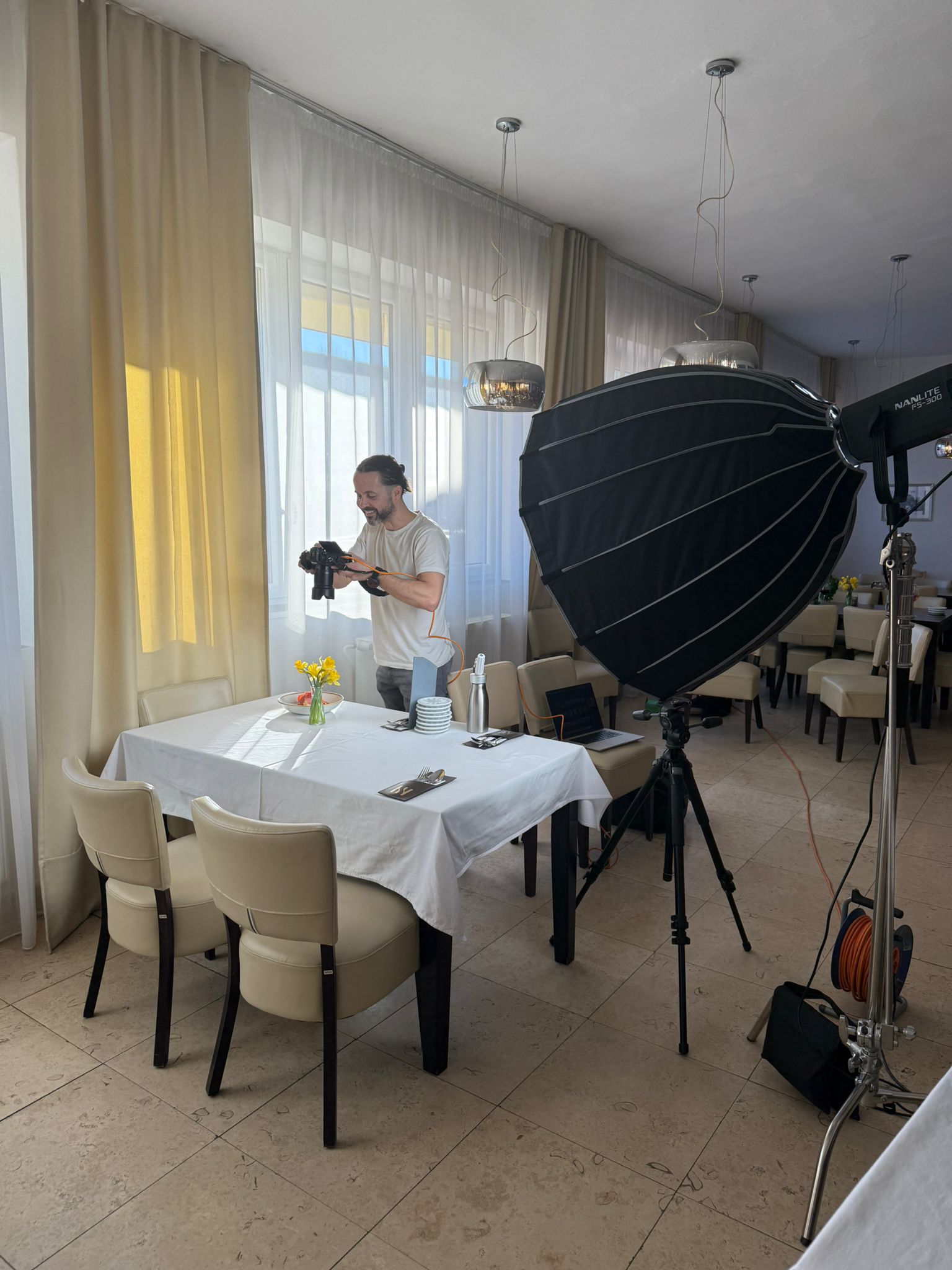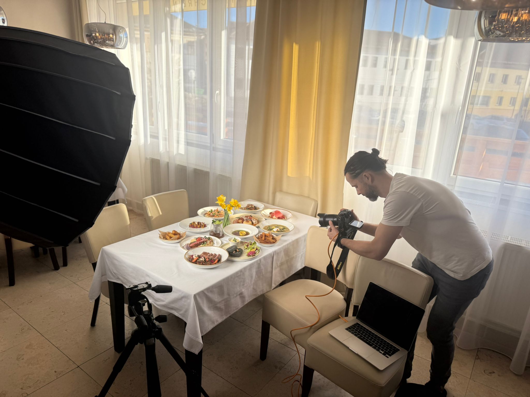 Pro focení jsem zvolil světlé podklady a čisté, vzdušné prostředí. Chtěl jsem, aby vynikly barvy jídel, textura surovin i jemnost prezentace. Pracoval jsem s přirozeným i u mělým světlem a hravými stíny, které dodávají fotografiím hloubku a atmosféru.