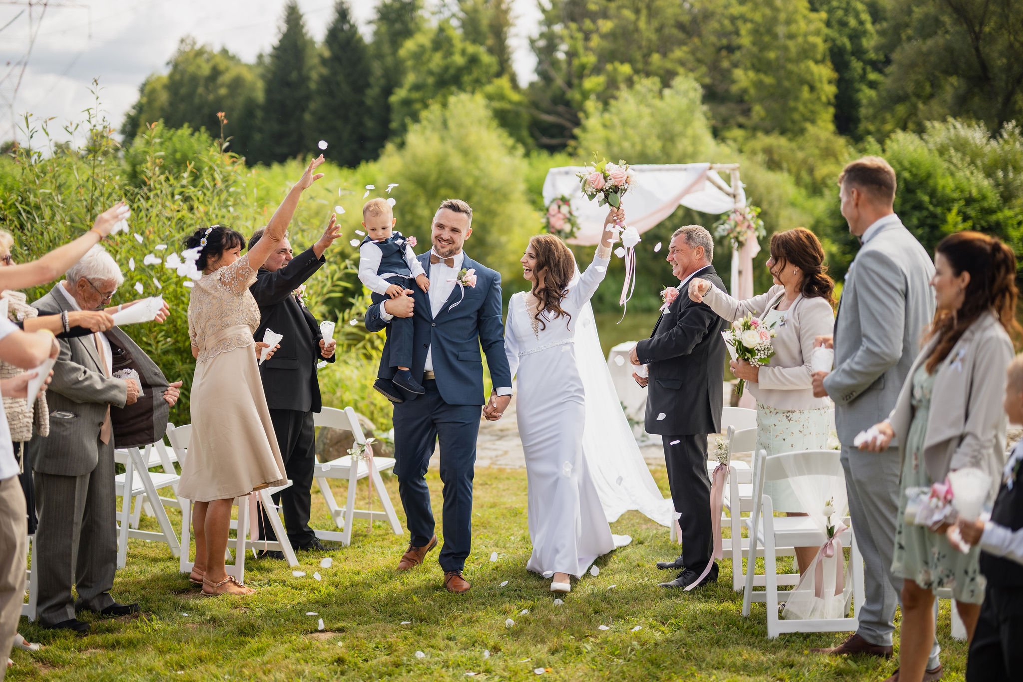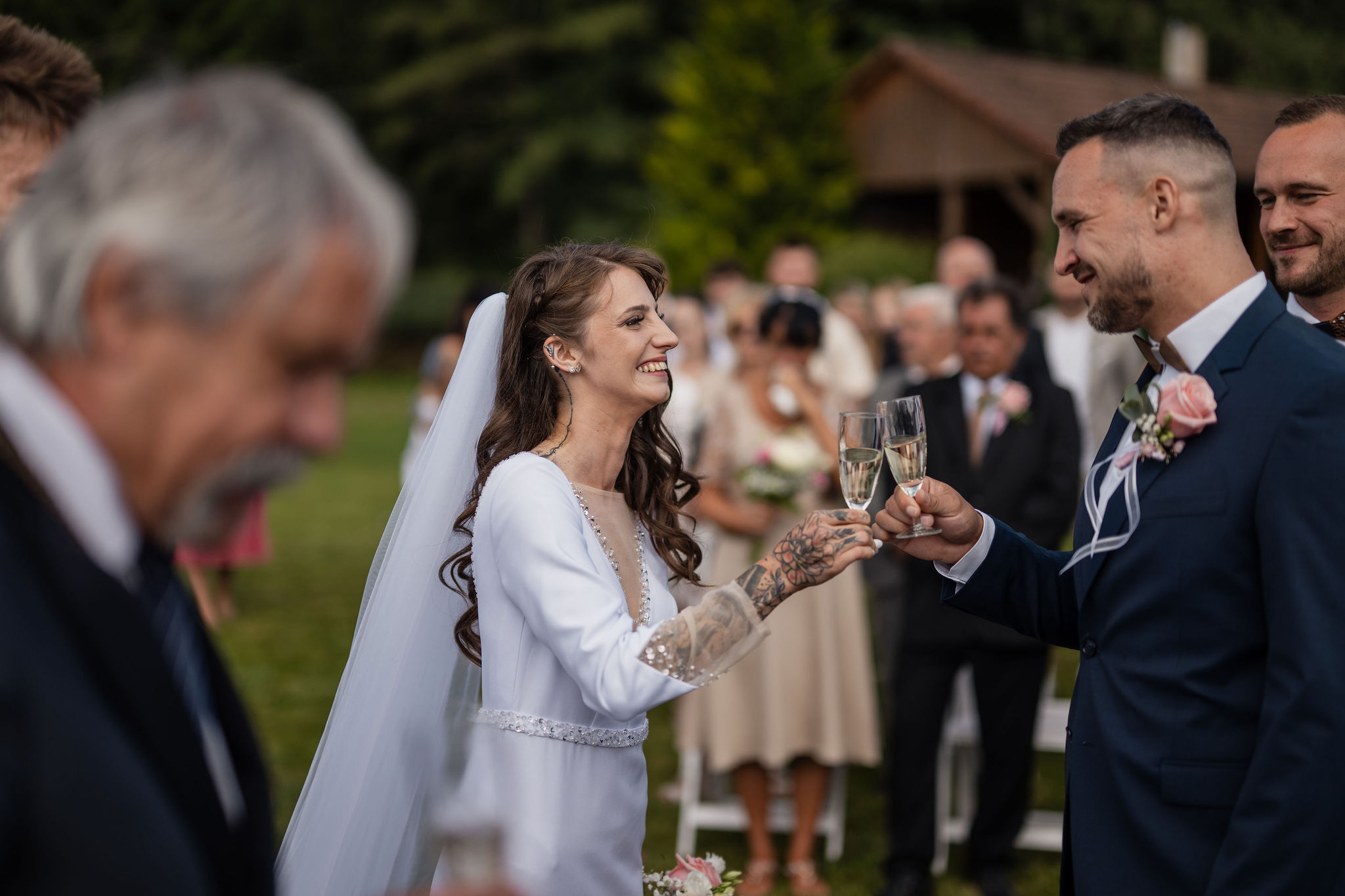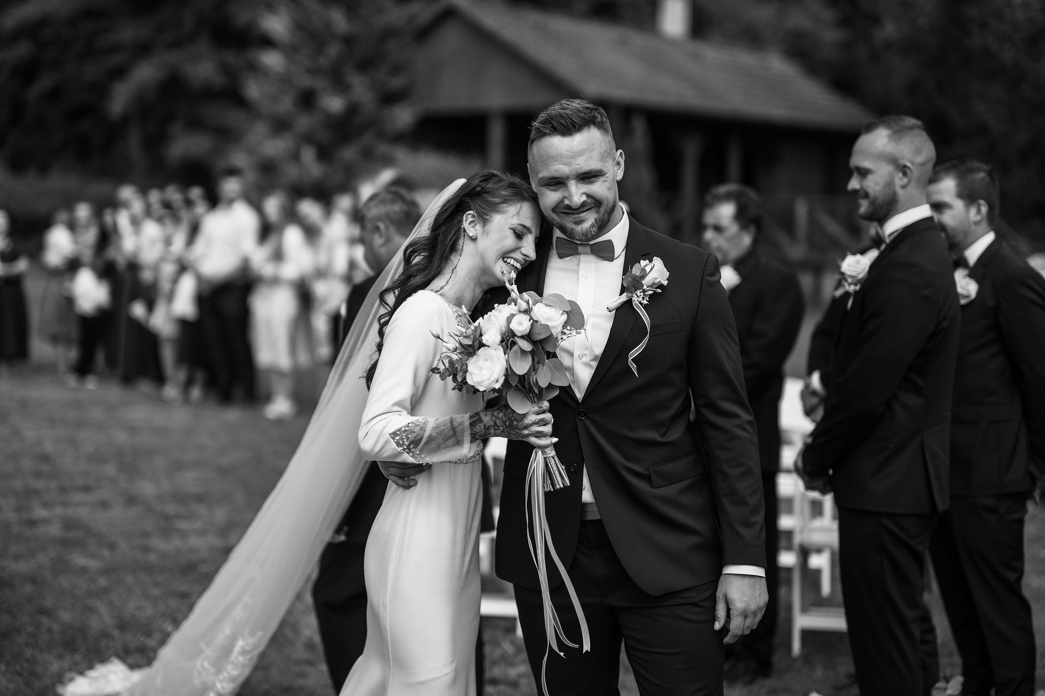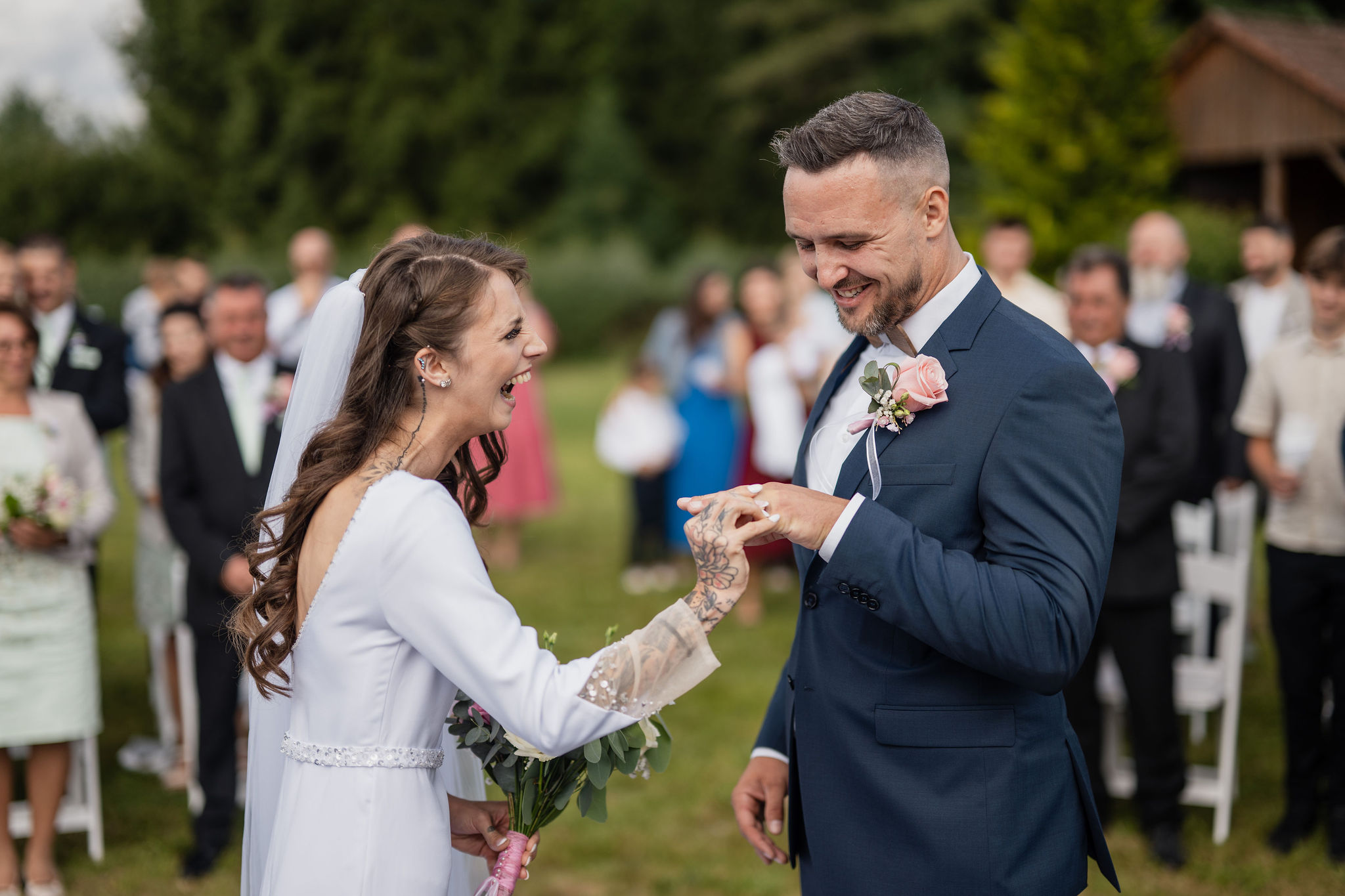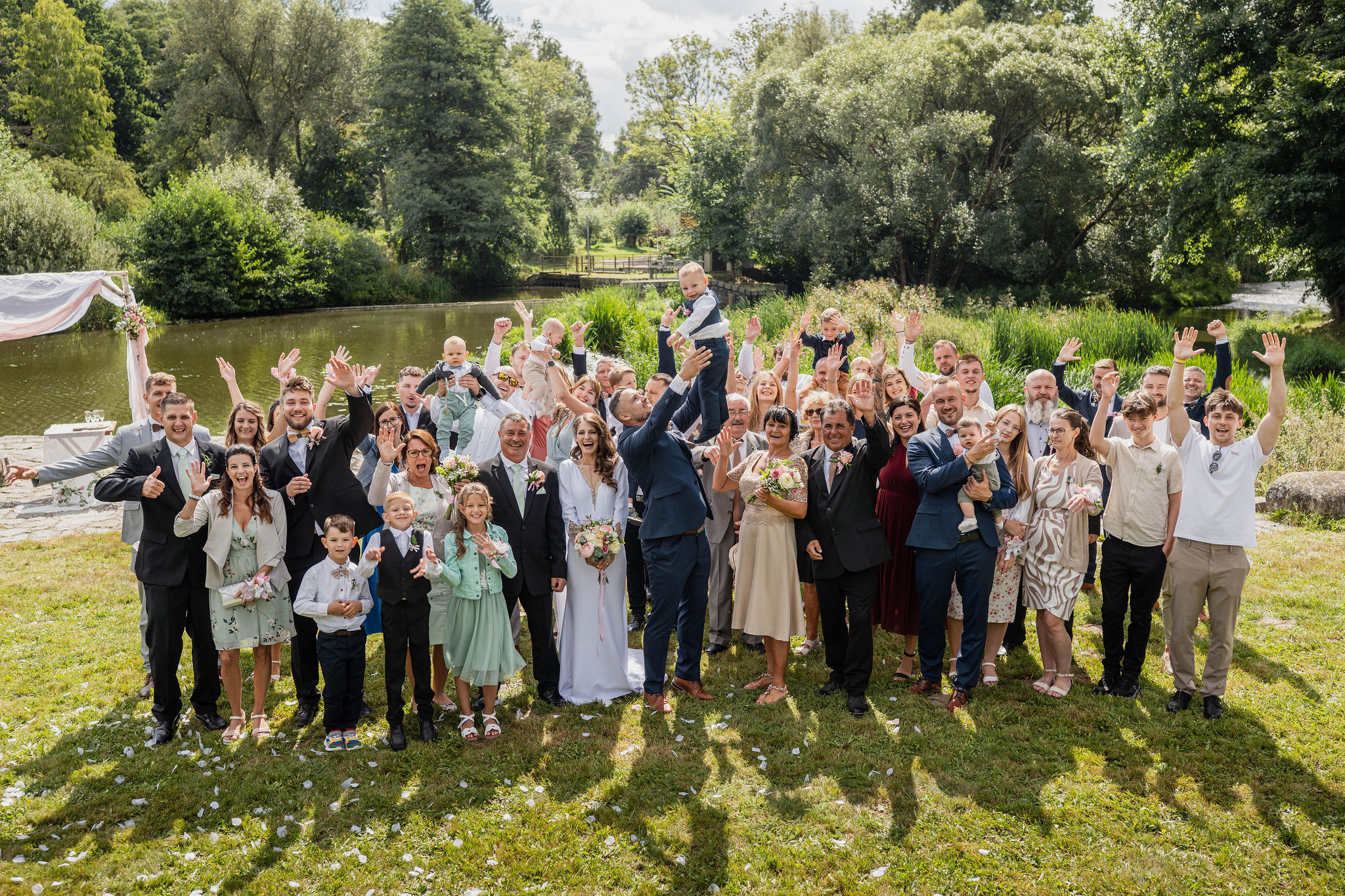 Celý den se odehrával u řeky – v penzionu U Černého Čápa. Bylo horké léto, slunce svítilo od rána do večera a svatba měla spíše podobu jedné velké vysmáté párty. Všude kolem byla spousta kamarádů, kteří se postarali o to, aby byl den plný smíchu a energie. Atmosféra byla uvolněná, lehce bláznivá a přesně taková, jakou si Lucka s Ondrou přáli.