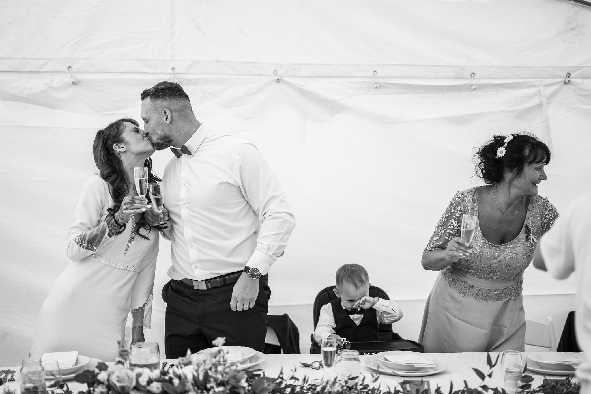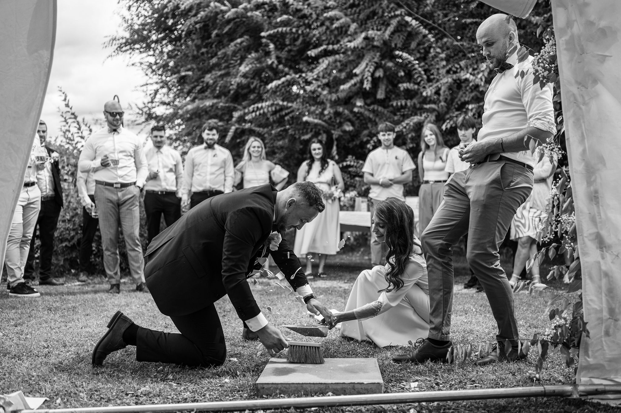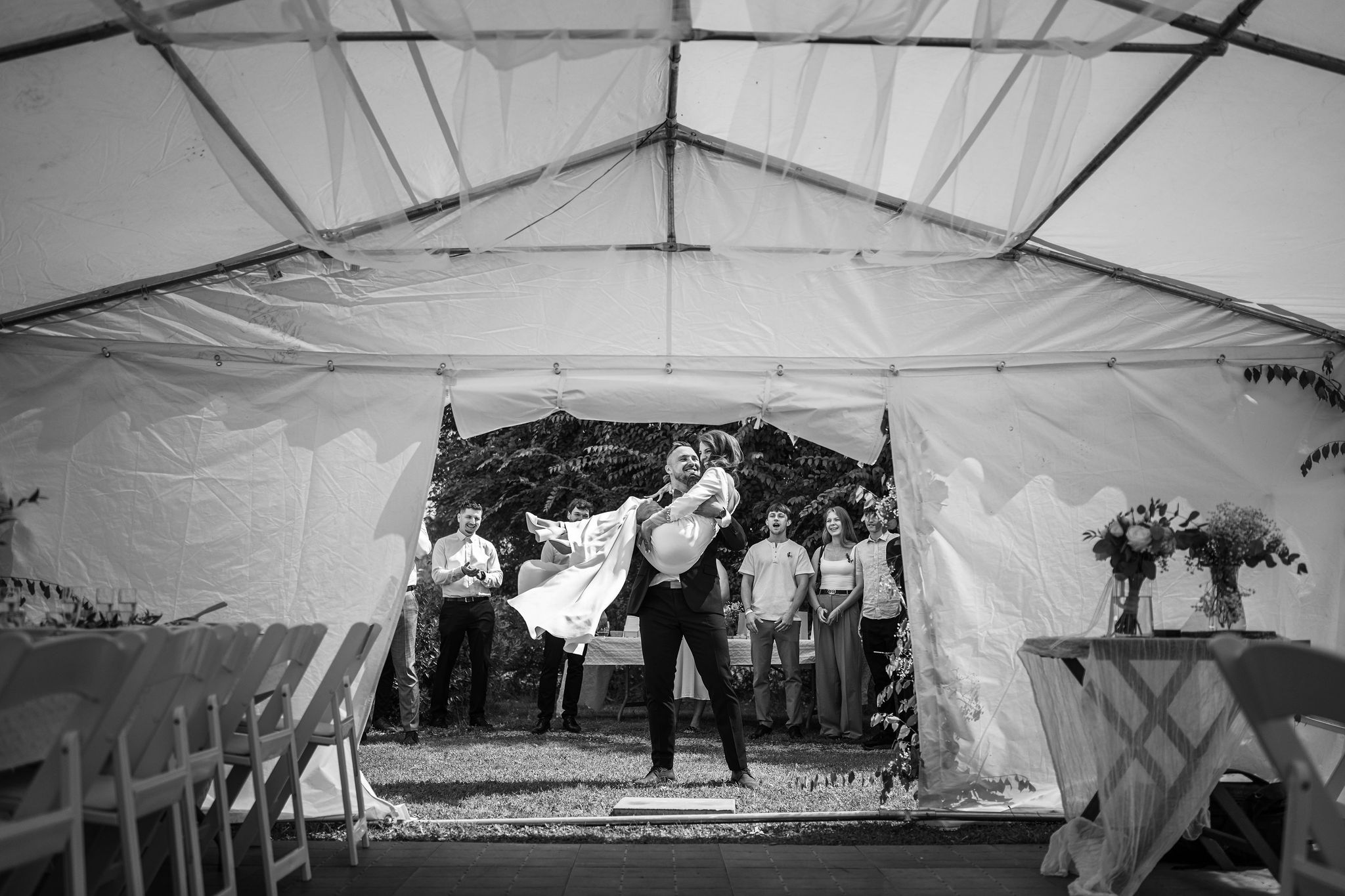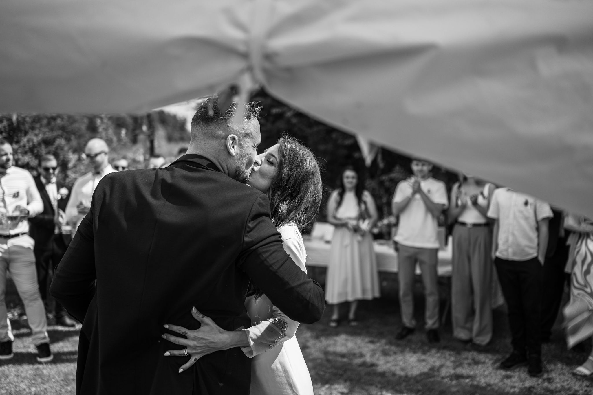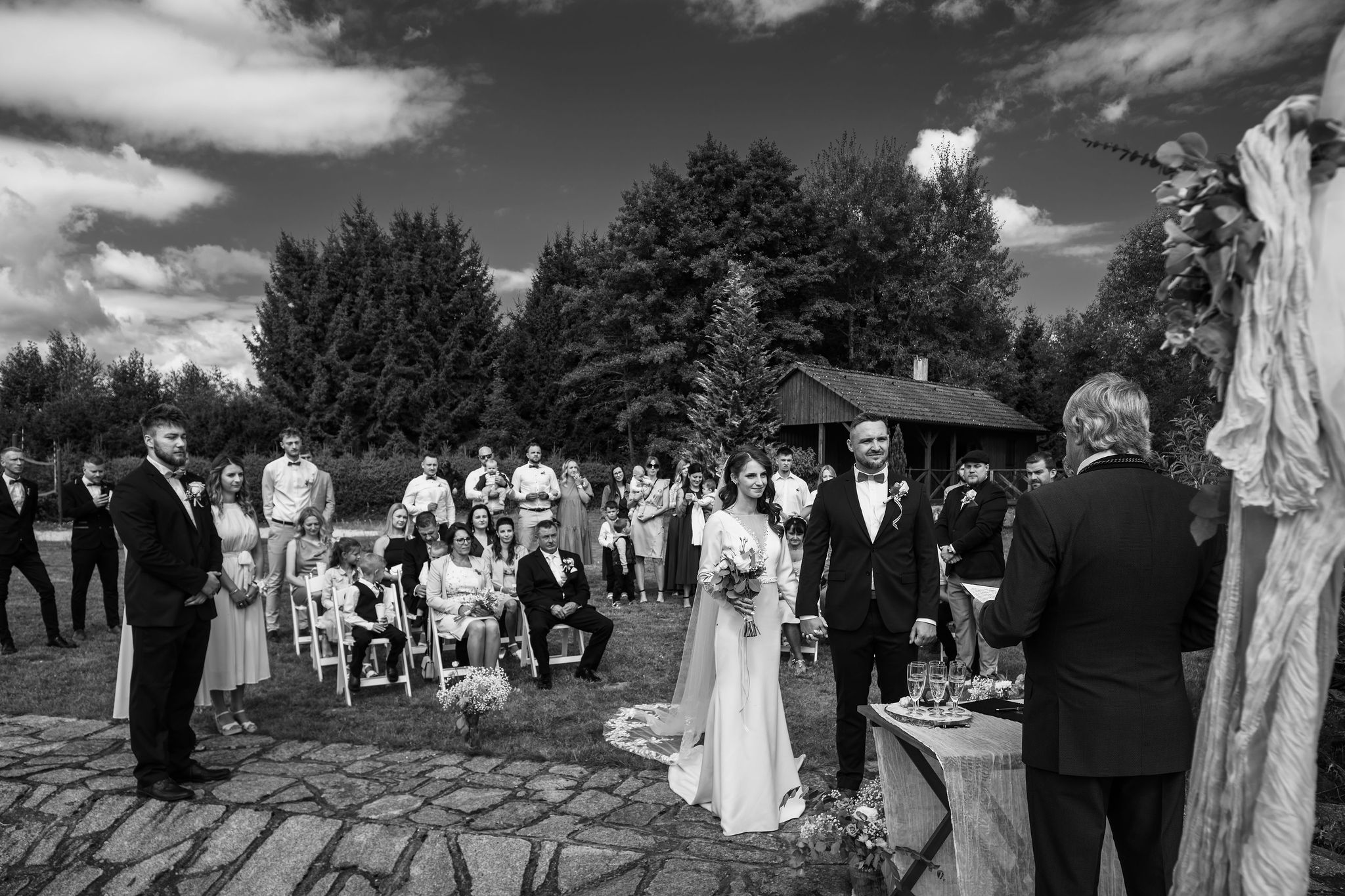 Celý den se odehrával u řeky – v penzionu U Černého Čápa. Bylo horké léto, slunce svítilo od rána do večera a svatba měla spíše podobu jedné velké vysmáté párty. Všude kolem byla spousta kamarádů, kteří se postarali o to, aby byl den plný smíchu a energie. Atmosféra byla uvolněná, lehce bláznivá a přesně taková, jakou si Lucka s Ondrou přáli.