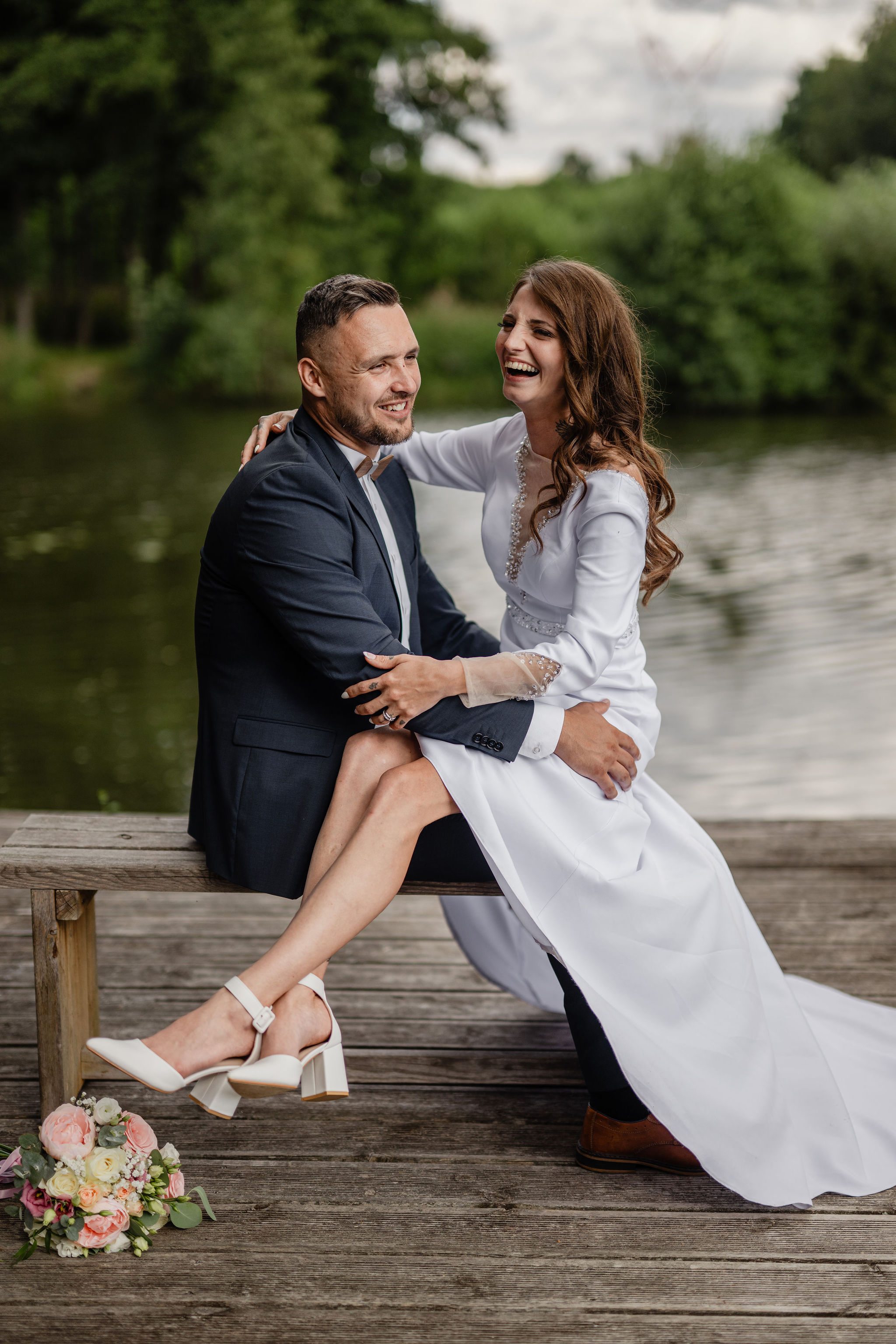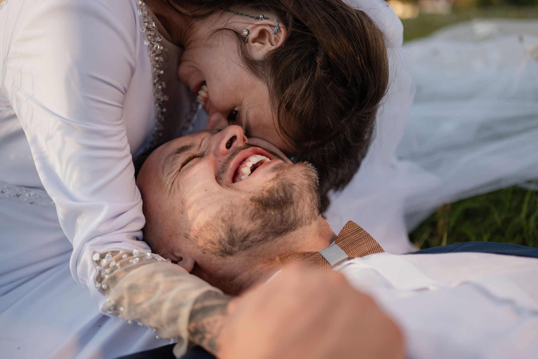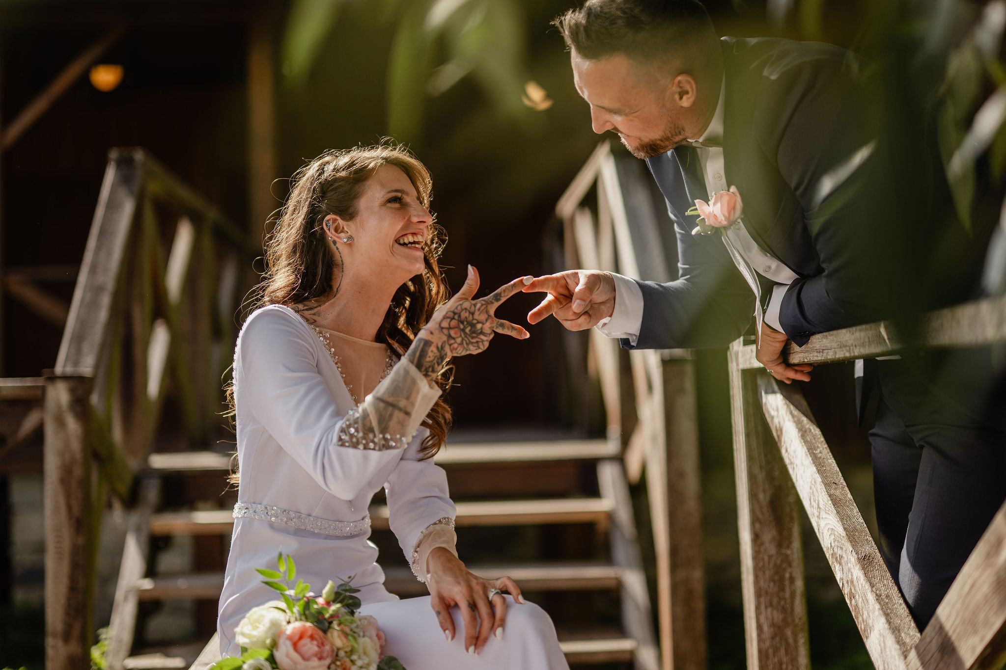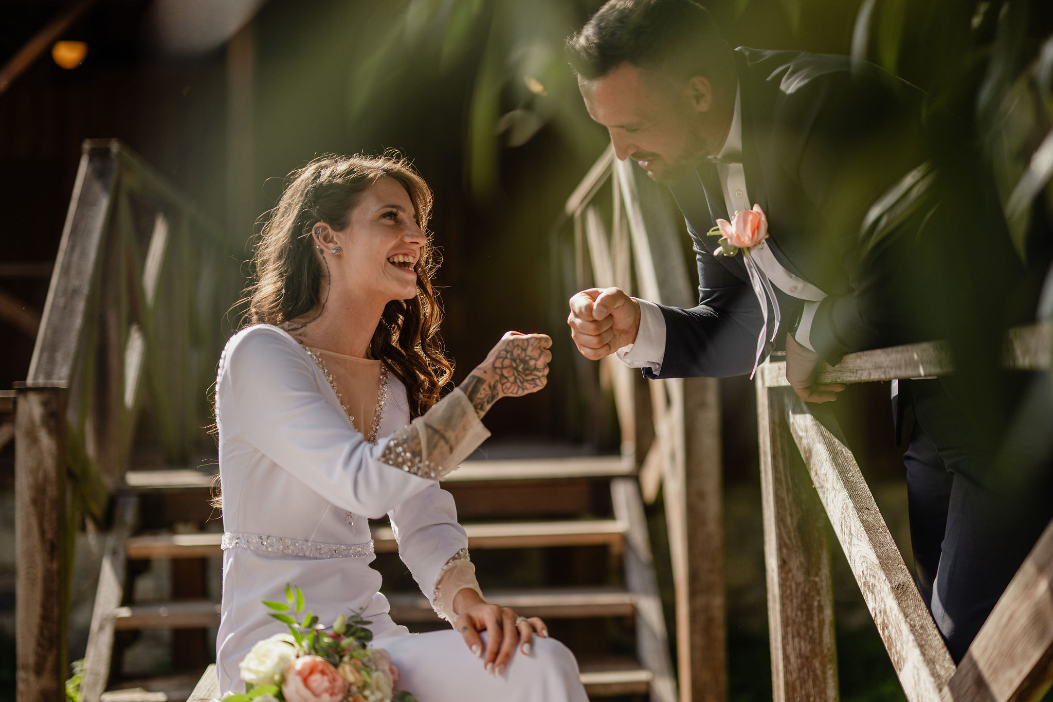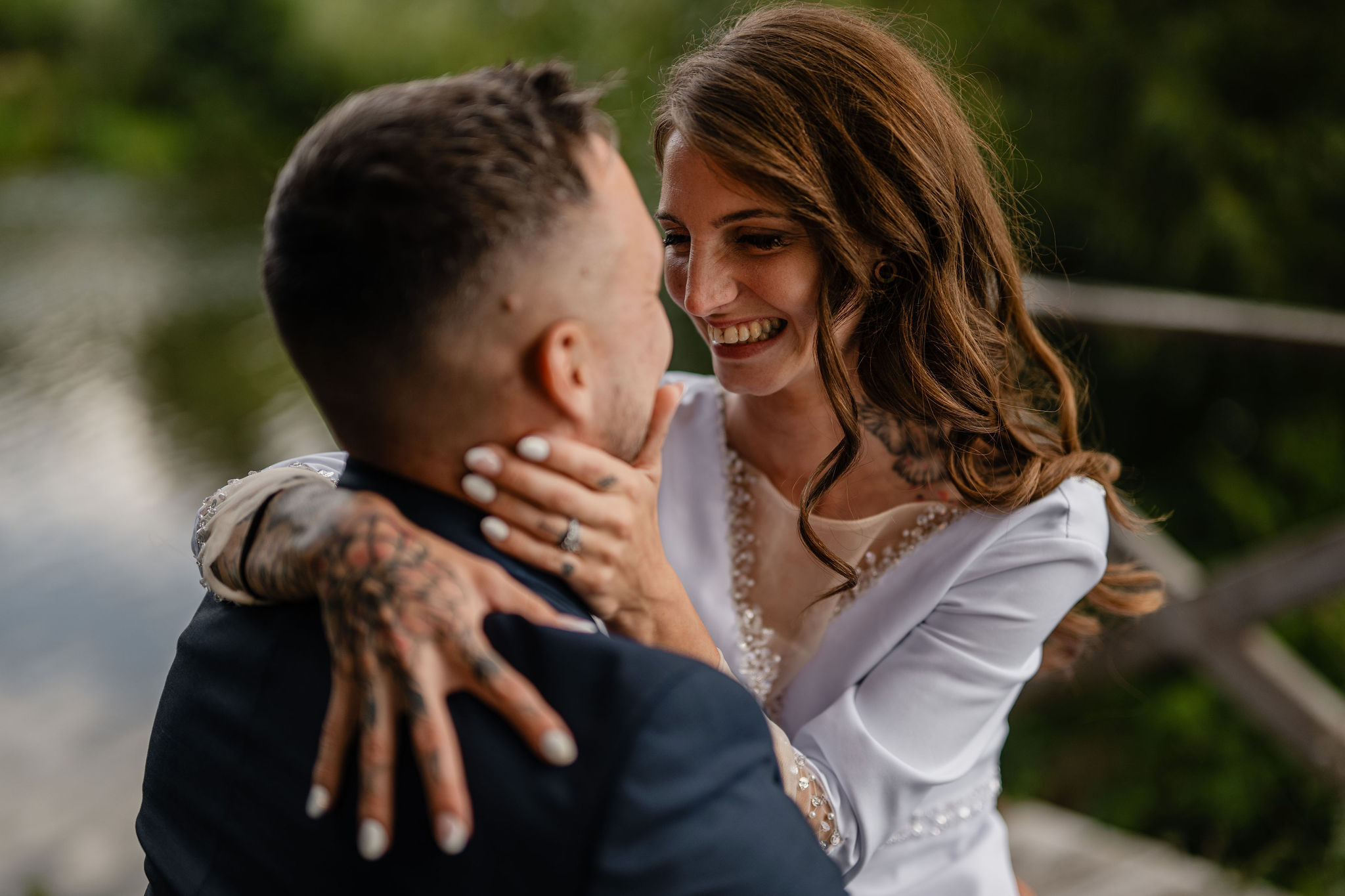 Fotili jsme hodně portrétů, ale nikdy to nebyla strnulá póza. Novomanželé se neustále smáli, reagovali při focení na mne a Alču, takže vznikaly spontánní, autentické snímky, ve kterých je radost i láska cítit na první pohled. Pro focení jsme využili okolí řeky a podvečer nás odměnil nádherným západem slunce nad kopci. Zlaté světlo podtrhlo atmosféru dne a dodalo fotografiím lehce snovou náladu.
