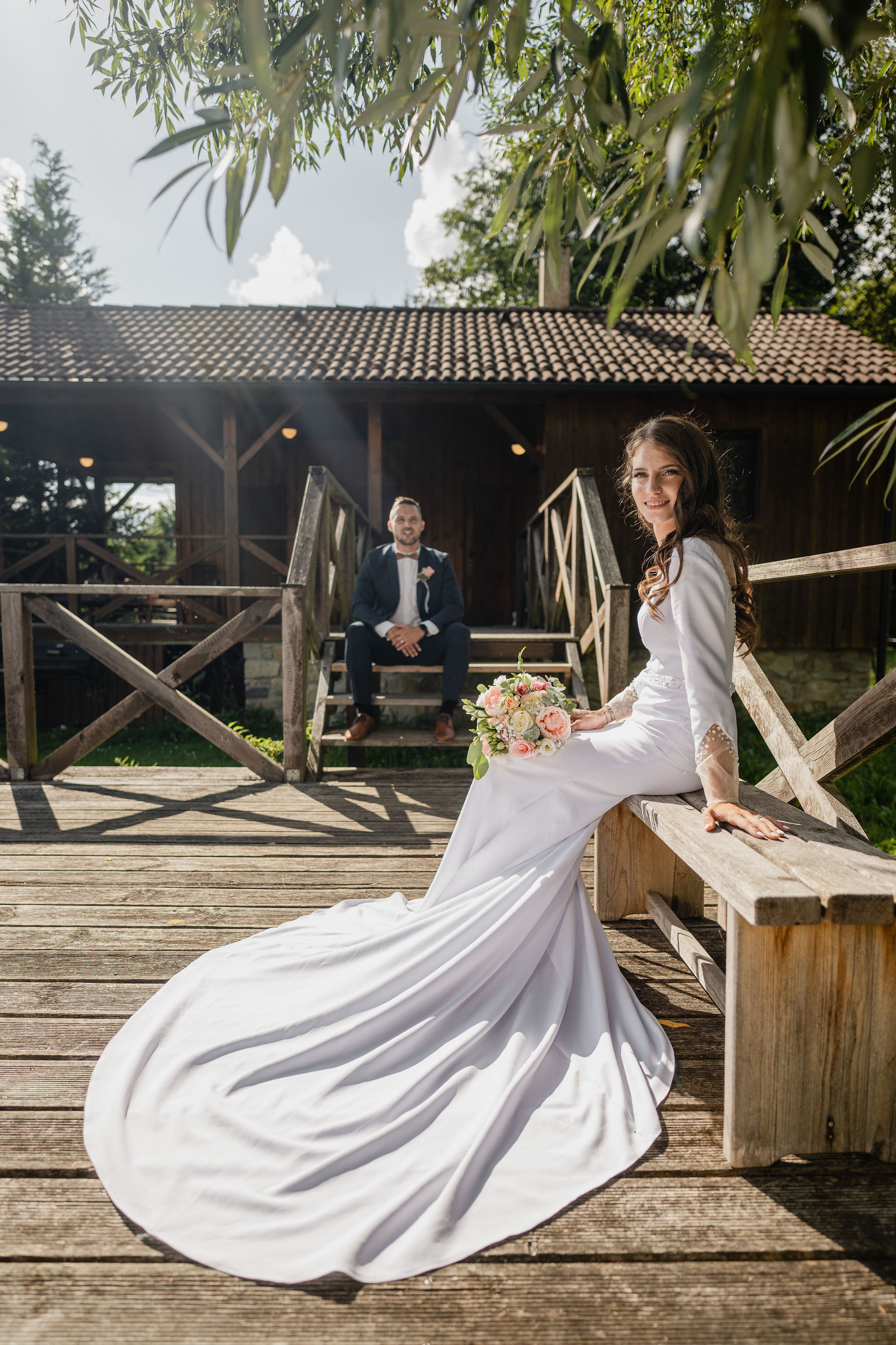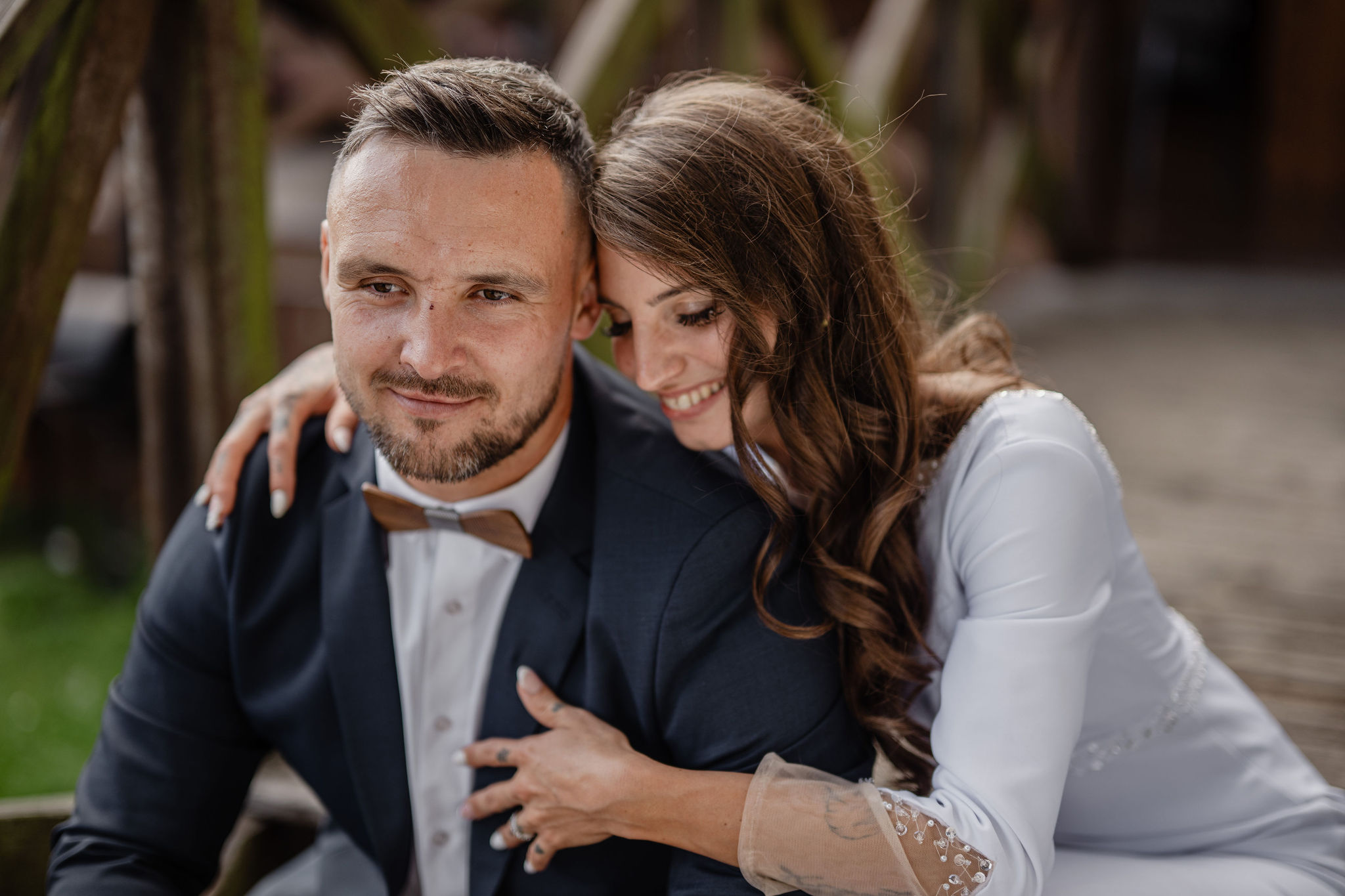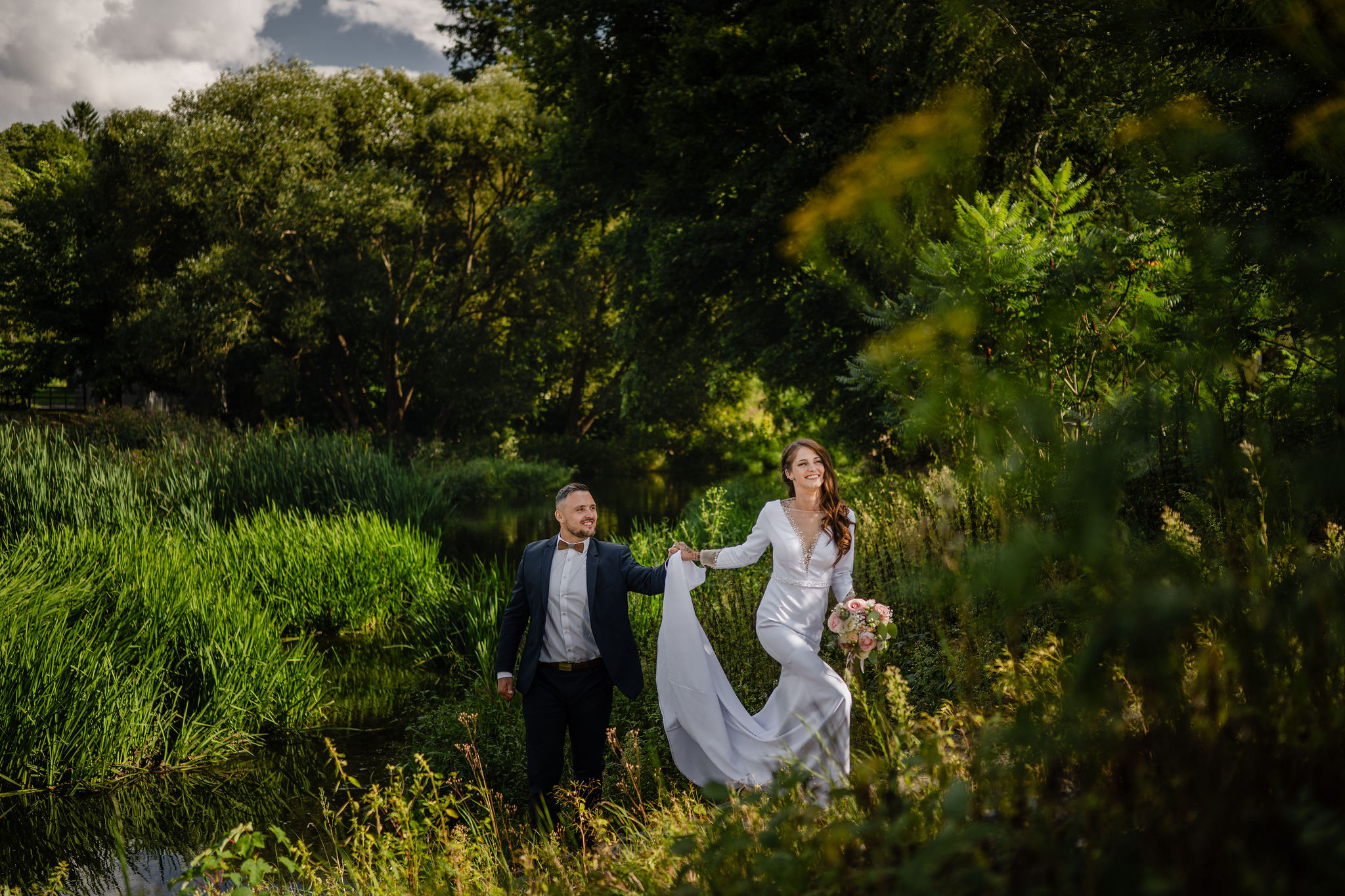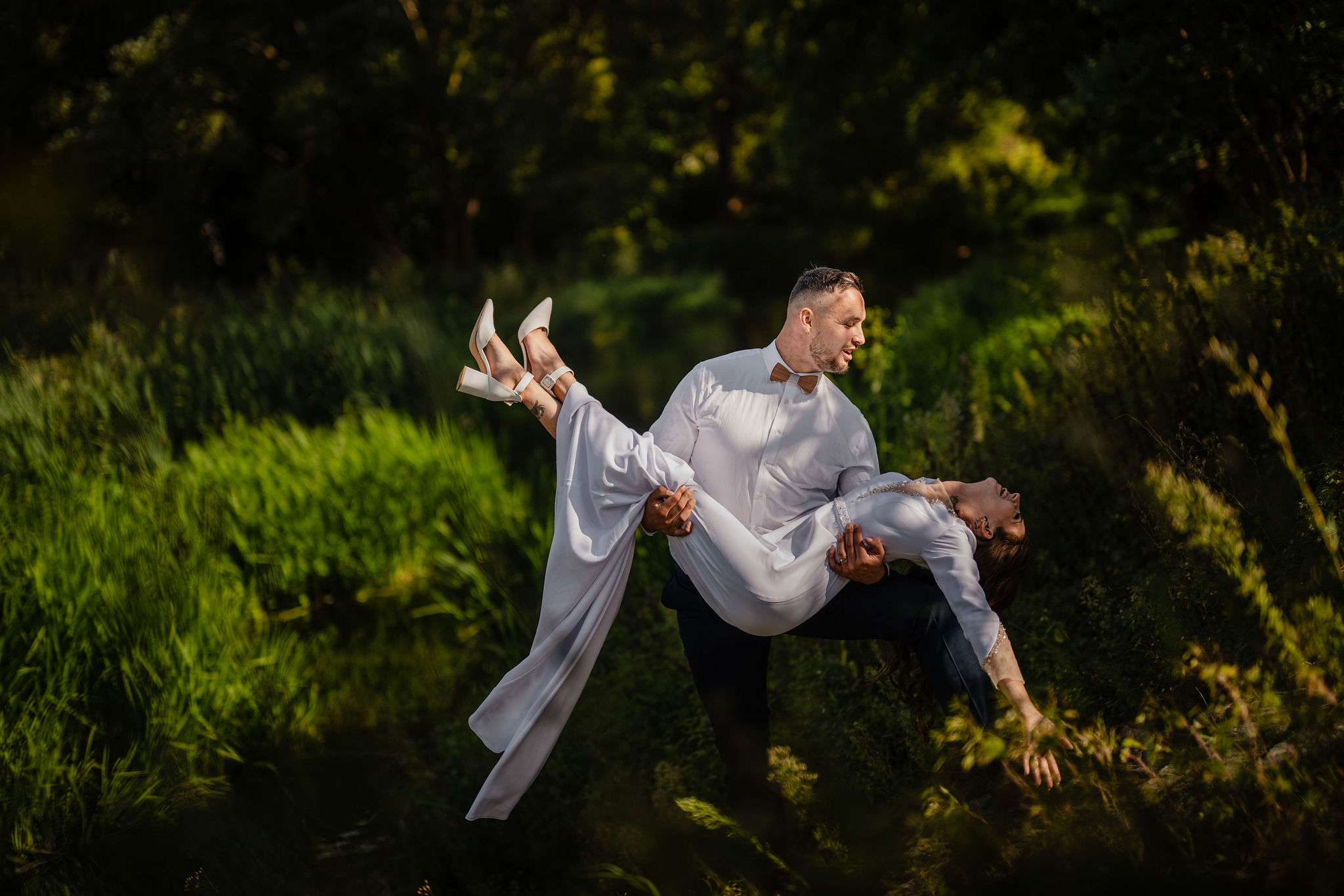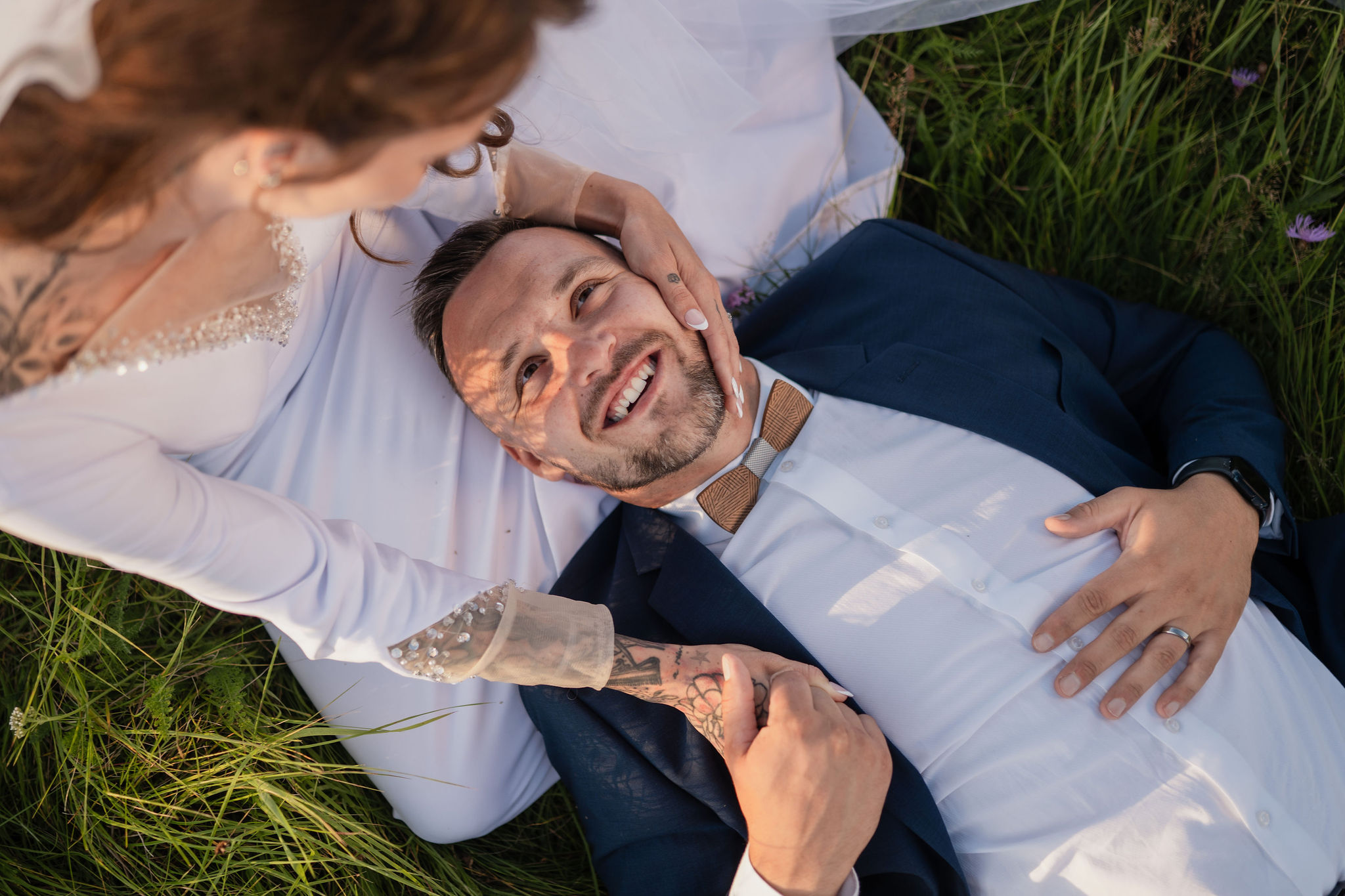 Fotili jsme hodně portrétů, ale nikdy to nebyla strnulá póza. Novomanželé se neustále smáli, reagovali při focení na mne a Alču, takže vznikaly spontánní, autentické snímky, ve kterých je radost i láska cítit na první pohled. Pro focení jsme využili okolí řeky a podvečer nás odměnil nádherným západem slunce nad kopci. Zlaté světlo podtrhlo atmosféru dne a dodalo fotografiím lehce snovou náladu.