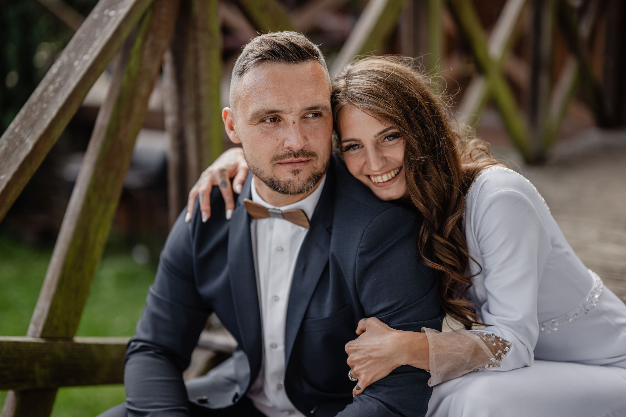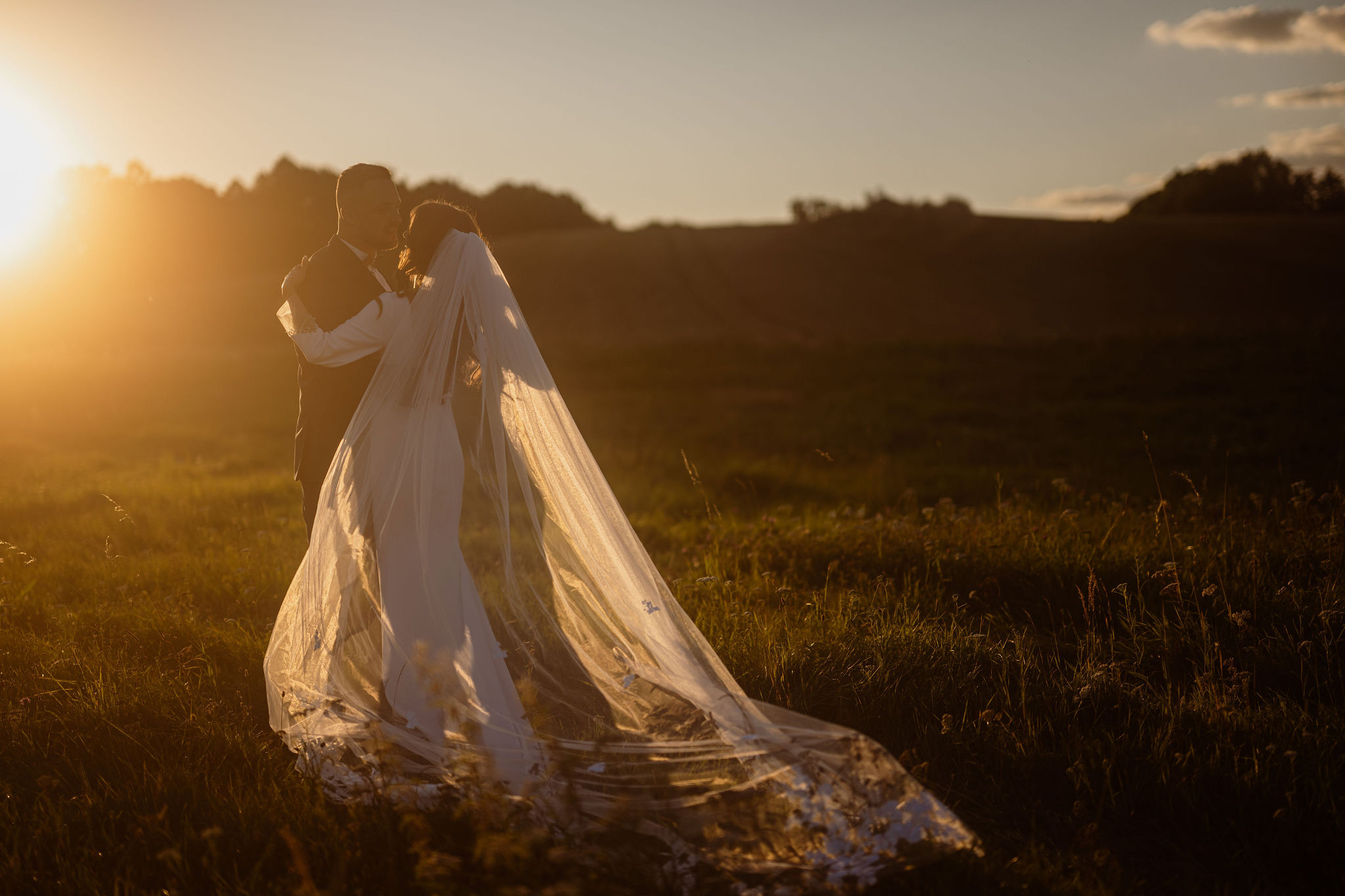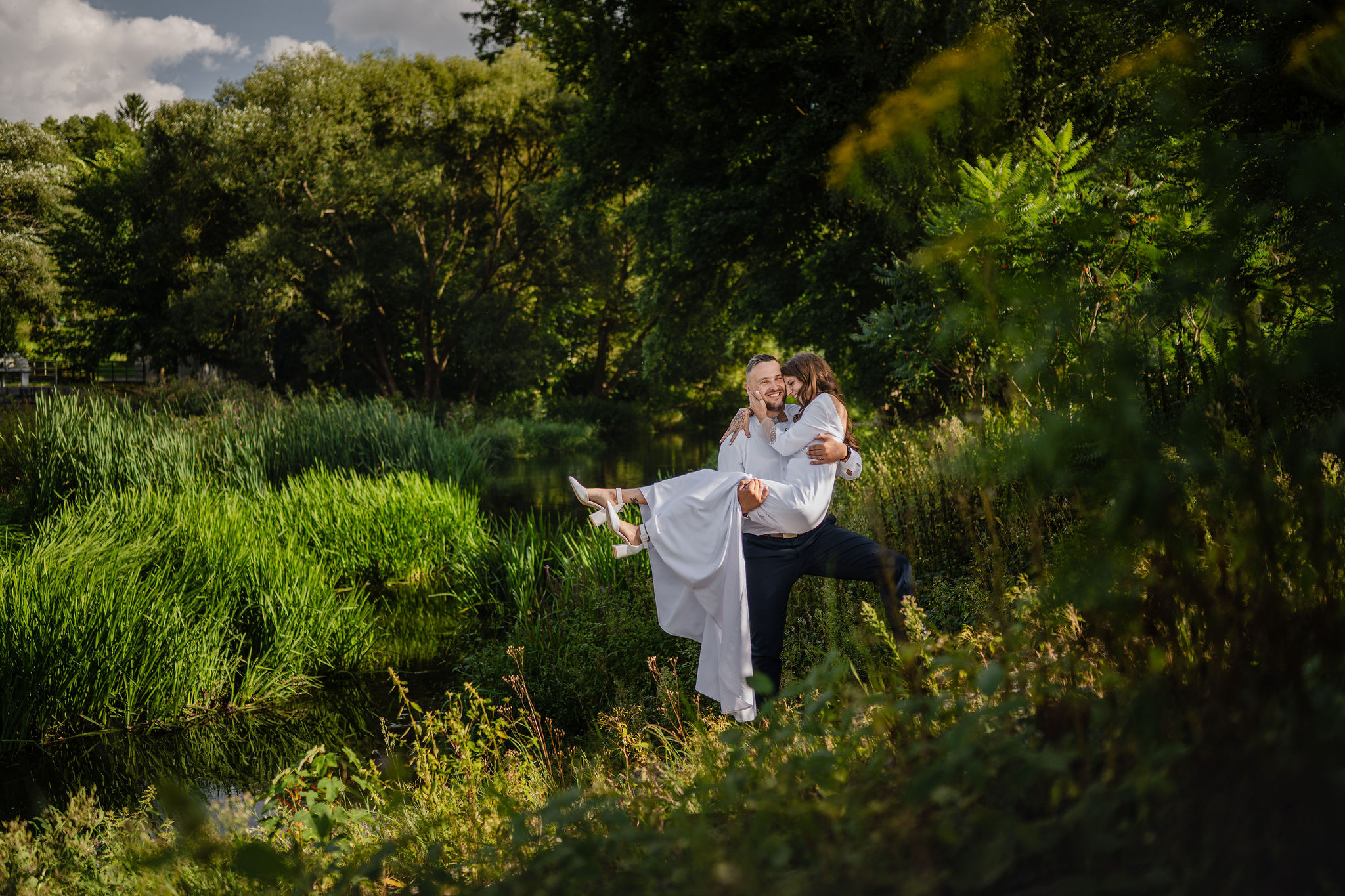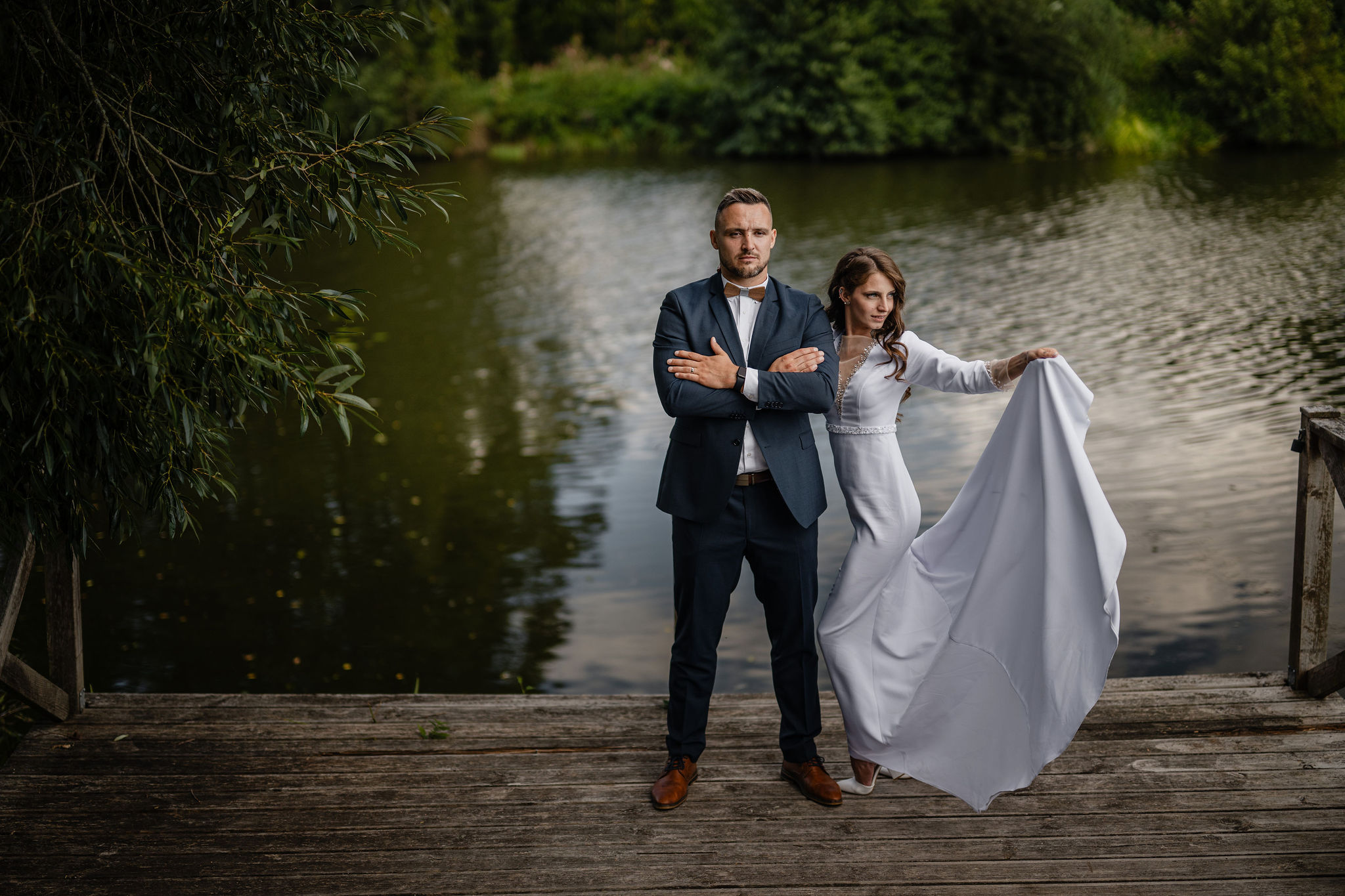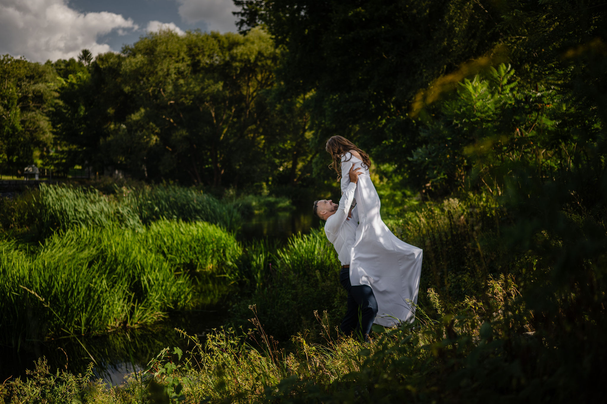 Fotili jsme hodně portrétů, ale nikdy to nebyla strnulá póza. Novomanželé se neustále smáli, reagovali při focení na mne a Alču, takže vznikaly spontánní, autentické snímky, ve kterých je radost i láska cítit na první pohled. Pro focení jsme využili okolí řeky a podvečer nás odměnil nádherným západem slunce nad kopci. Zlaté světlo podtrhlo atmosféru dne a dodalo fotografiím lehce snovou náladu.