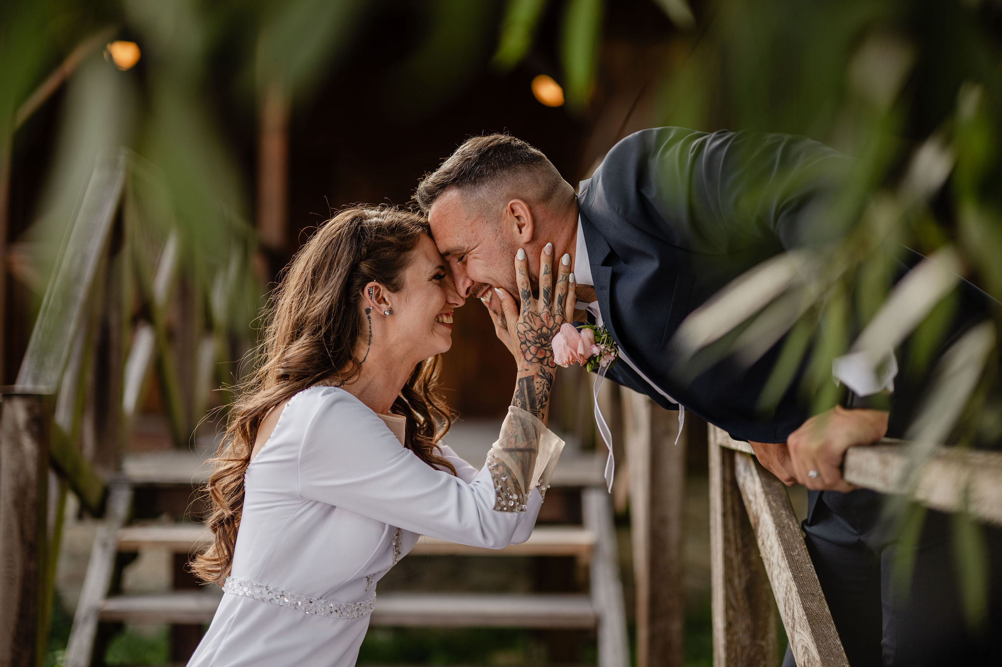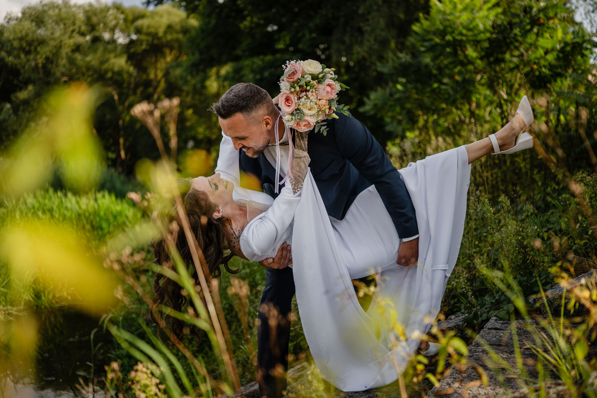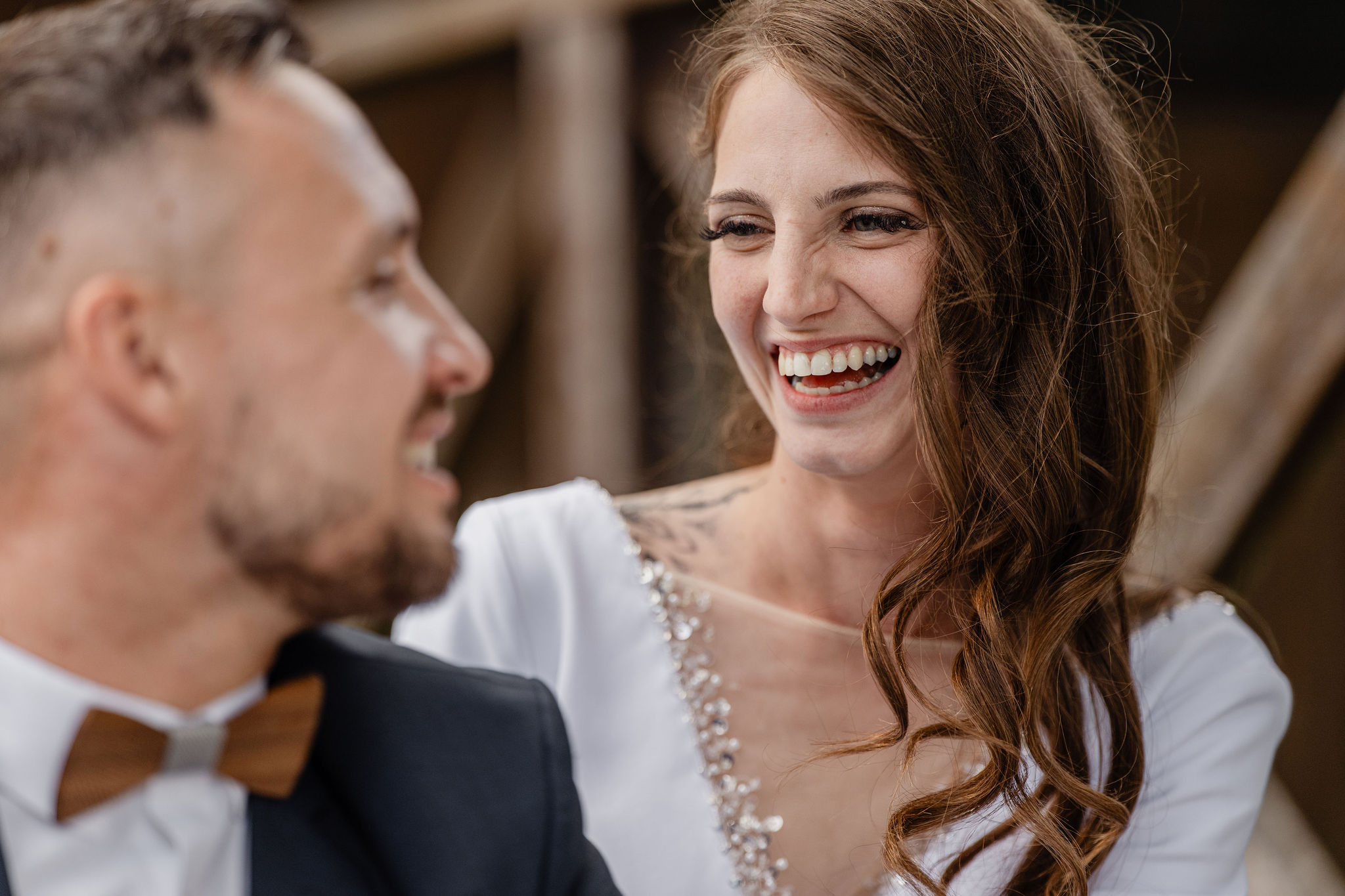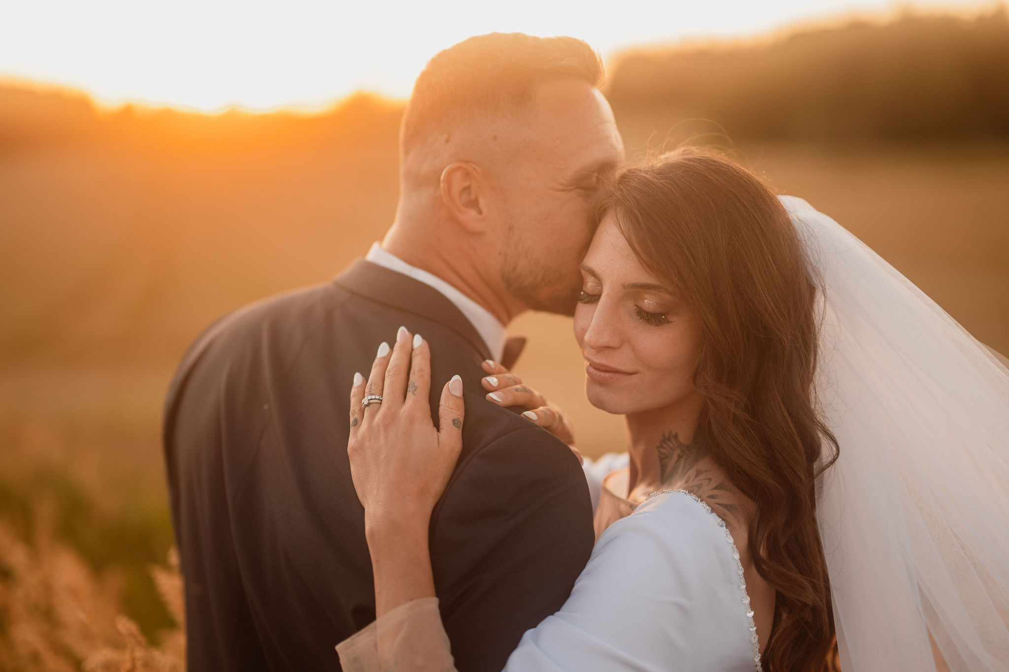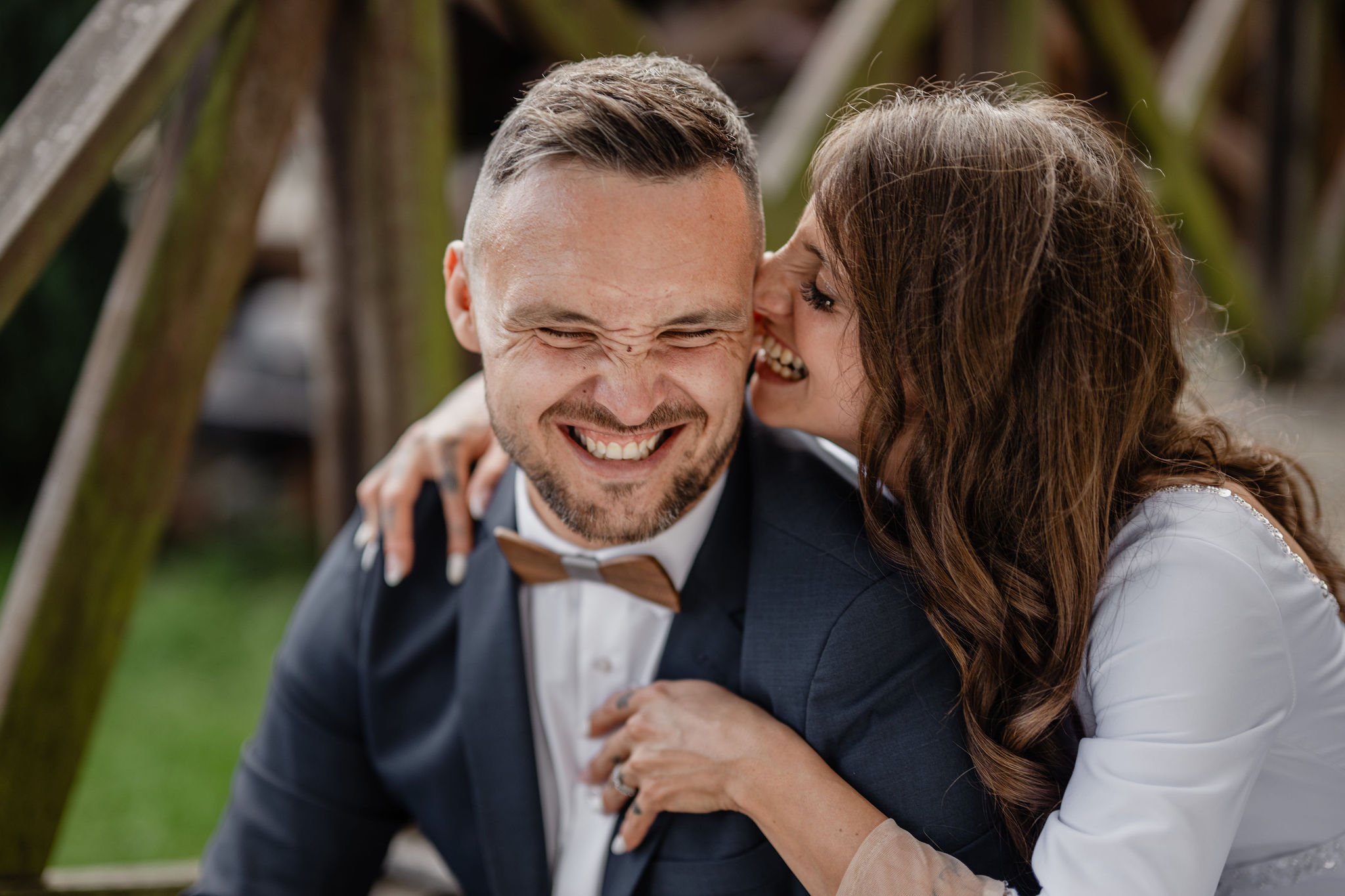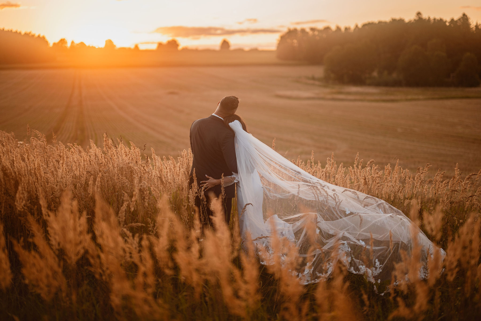 Fotili jsme hodně portrétů, ale nikdy to nebyla strnulá póza. Novomanželé se neustále smáli, reagovali při focení na mne a Alču, takže vznikaly spontánní, autentické snímky, ve kterých je radost i láska cítit na první pohled. Pro focení jsme využili okolí řeky a podvečer nás odměnil nádherným západem slunce nad kopci. Zlaté světlo podtrhlo atmosféru dne a dodalo fotografiím lehce snovou náladu.