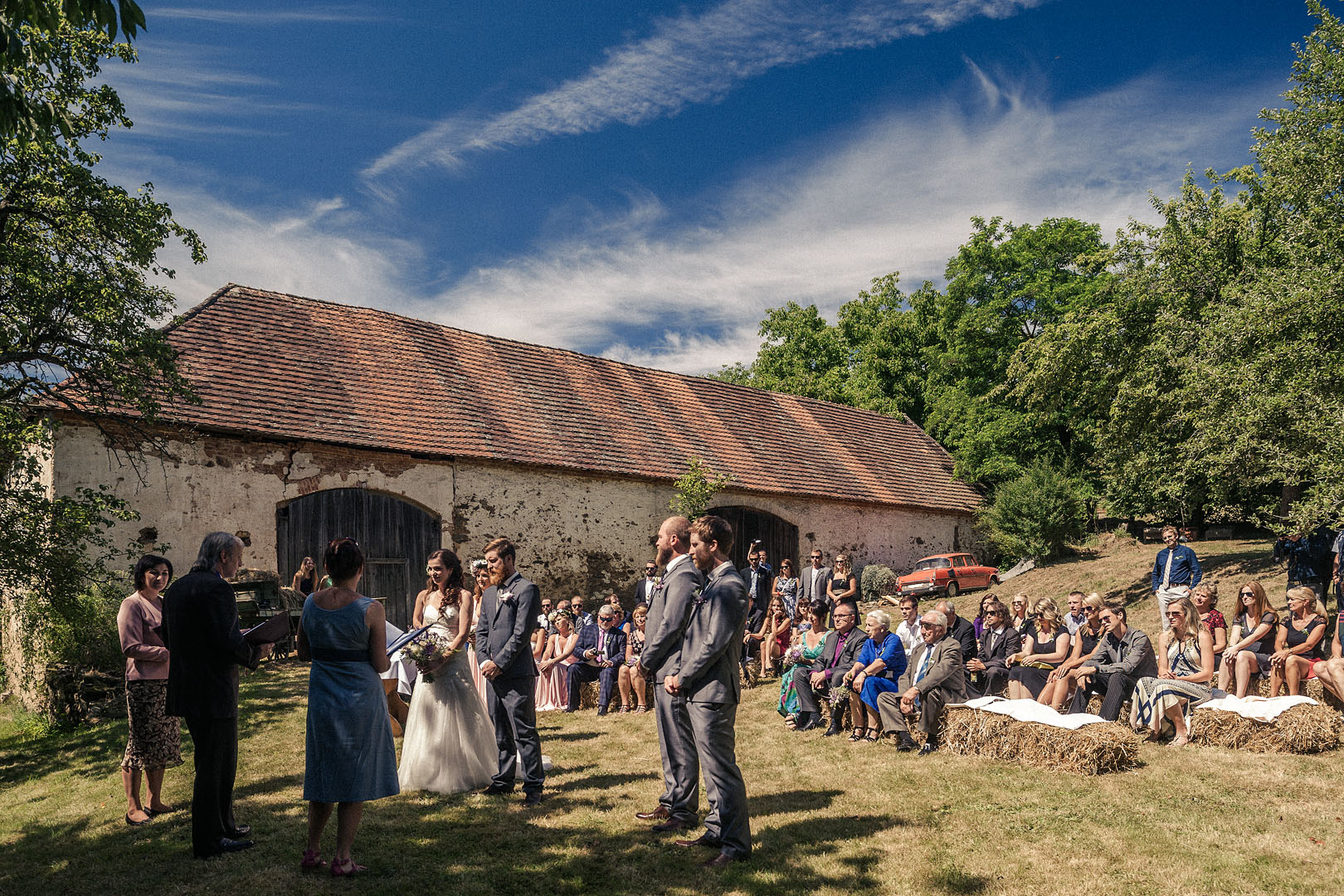 Každý fotograf má nějaké představy o místě, kde by chtěl fotografovat. Toto bylo splnění jednoho z mých tajných snů :) Asi 14 dní před svatbou, když Míša a Scotty spolu s přáteli dávali dohromady prostory, jsme se u nich na statku sešli a mě bylo jasné, že se mám na co těšit...