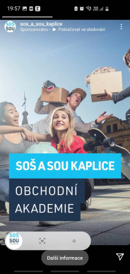 Snímky propagují obor obchodní akademie se zaměřením na logistiku a turismus. Dále obory kuchař a číšník a parkouristé představují řemeslné obory učiliště.