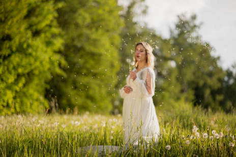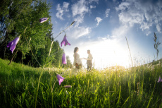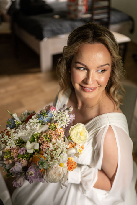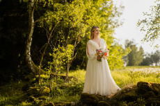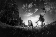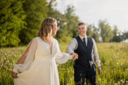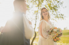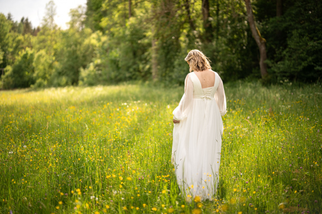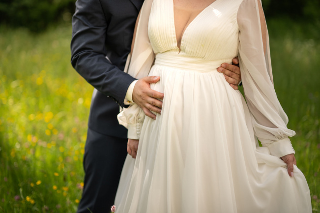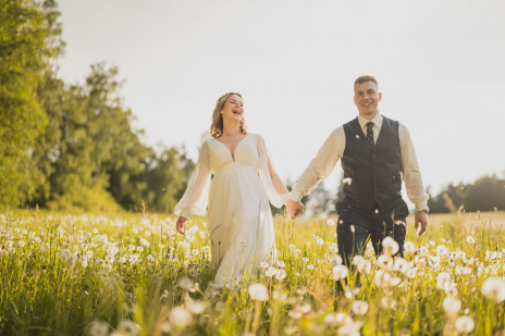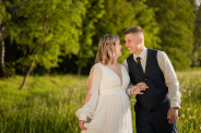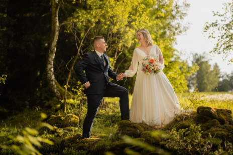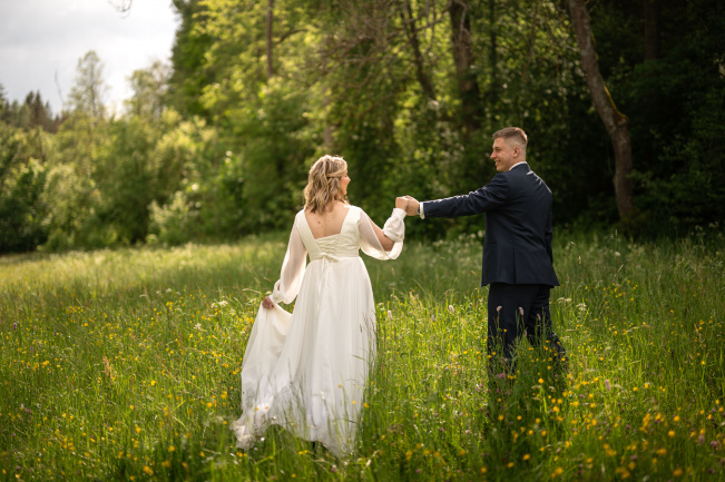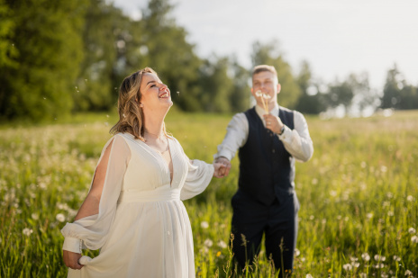 Po svatební hostině se počasí zázračně změnilo. Slunce začalo prosvítat skrze mraky a poskytlo nádherné světlo pro odpolední focení. Vyrazili jsme s novomanželi na květnatou louku, kde mezi zvonečky a odkvetlými pampeliškami vznikly ty nejkrásnější snímky. Podvečerní světlo dodalo fotkám magický nádech, který jen podtrhl romantiku tohoto jedinečného dne.